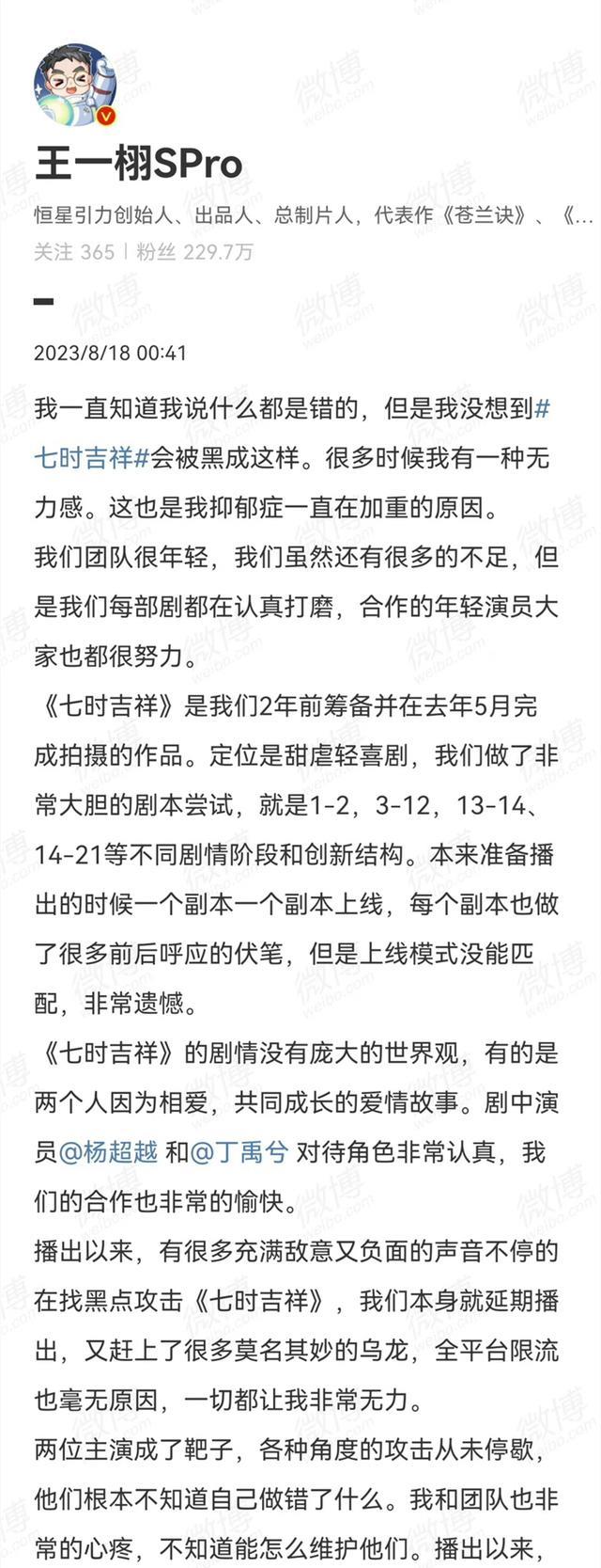不仅有演员直播卖惨,就连《七时吉祥》制片人王一栩也坐不住了,他针对《七时吉祥》扑街一事发表长文,先是向公众透露自己有抑郁症,随后又放出了他和丁禹兮、杨超越的聊天记录,夸赞他们在拍戏时多么认真敬业,不应该是现在这样的局面。作为幕后工作人员,他的戏一直挺多的,这次表面是夸两位主演,实际上也不难看出是将剧集拉胯的播出效果暗暗甩锅给了演员。