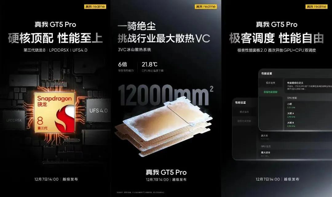 真我GT5pro是要强游戏手机的饭碗啊 先来看看外观,采用居中挖孔超窄边框的设计,颜值不错,本以为是直屏但是徐起称是“直屏的观感,曲屏的手感”我估计应该和小米14pro的微曲面相似。 不过最强的还是它的配置,骁龙8gen3三件套,而且在手机里面塞进了面积12000mm²的VC散热系统,这也是手机上最大的散热板,所以理论上来说GT5pro的发热应该控制的不错。而且还提供极客性能面板2.0,开放GPU和CPU调度,给喜欢折腾的小伙伴调教手机。 真我GT5pro将会在12月7号发布,喜欢玩游戏的小伙伴不能错过