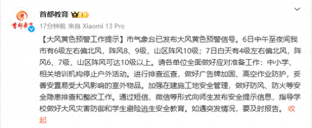 △北京市教委发布消息要求各单位全面做好应对准备工作,中小学、相关培训机构停止户外活动。图/首都教育官方微博