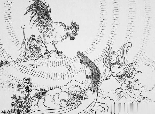 昴日星官闻言即施法现出本相,却是一只双冠大公鸡,有五六尺高,昂头对着女怪“喔~喔~”叫了一声,女怪伏倒在地,化身成一只琵琶大小的蝎子精。星官再叫一声,蝎子精浑身酥软,当场死去。