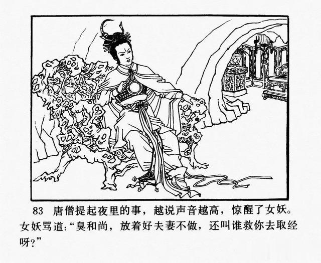 师徒二人正你一言我一语攀谈,女怪却被惊醒,听闻“取经去也”厉声高叫道:“放着好好的夫妻不做,取什么经去?”