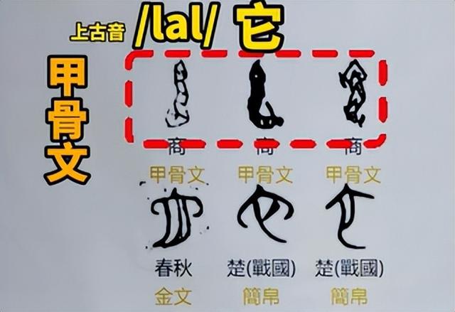 而“它”的异体字,也就是现在的“他”,与“蛇”同源,均是甲骨文“蛇”字的变体。由于先秦到现在,人们说话时喜欢在句尾加“lal”这样的语气词,在古文中体现为“也”。