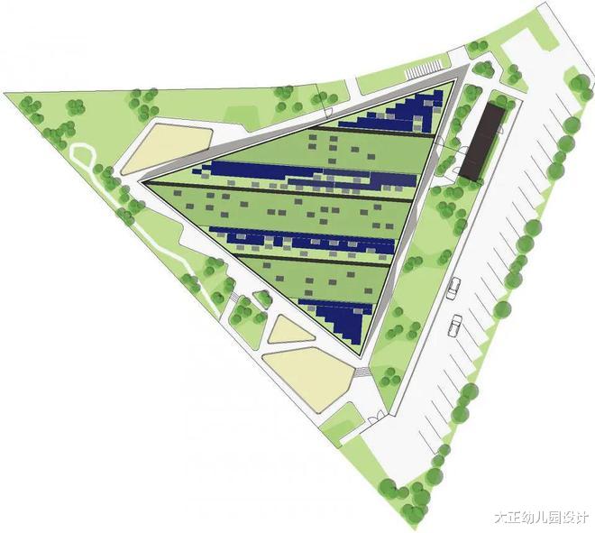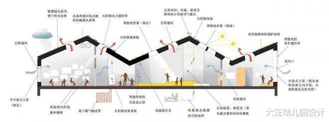 幼儿园所需能源主要来源于太阳能和地热能。其中采暖和热水供应主要依靠朝南屋顶上的50平方米太阳能集热板,以及1000米地热管道。电器工作需要的电能则由250平方米的太阳能电池板转化而来。