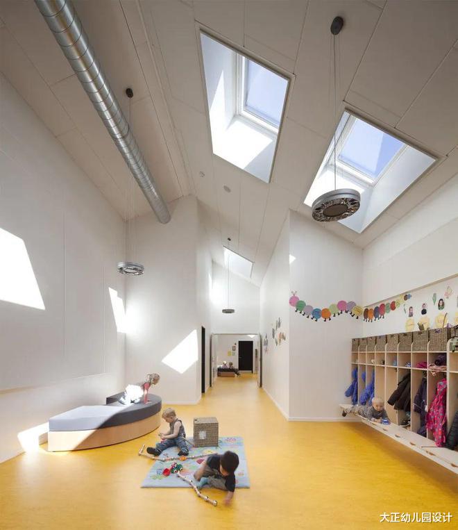 首先是光线控制,幼儿园在屋顶、墙壁上开辟了大量窗户,保证室内每个角落都能够获得足够的采光。如果光线过于刺眼,室外的遮阳帘还会自动打开进行遮挡。这种智能化的设计确保了孩子们始终处于明亮、温馨的活动环境中。