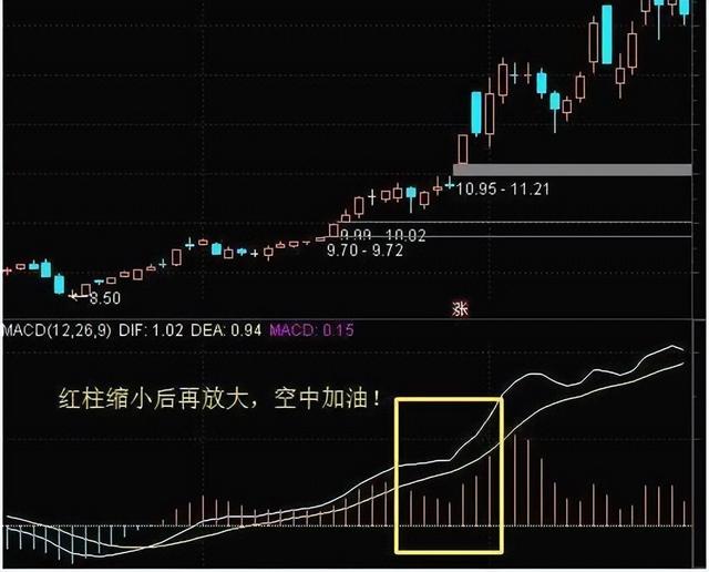 股价上升趋势下,MACD出现一片大红柱。股价进入调整之后,MACD红柱减小。但是随后股价出现了放量阳线,把MACD的红柱再放大。这时候就属于MACD空中加油,还继续看涨!