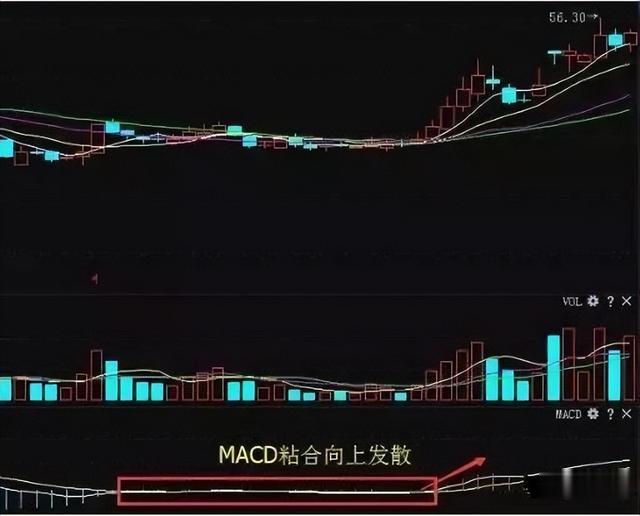 MACD黄白线长期贴近0轴运行,一旦向上发散了,则股价向上爆发力度很强!