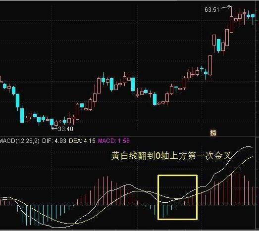 3、MACD黄白线0轴上第一次金叉(黄白线在0轴上方第一次金叉的准确率最高)