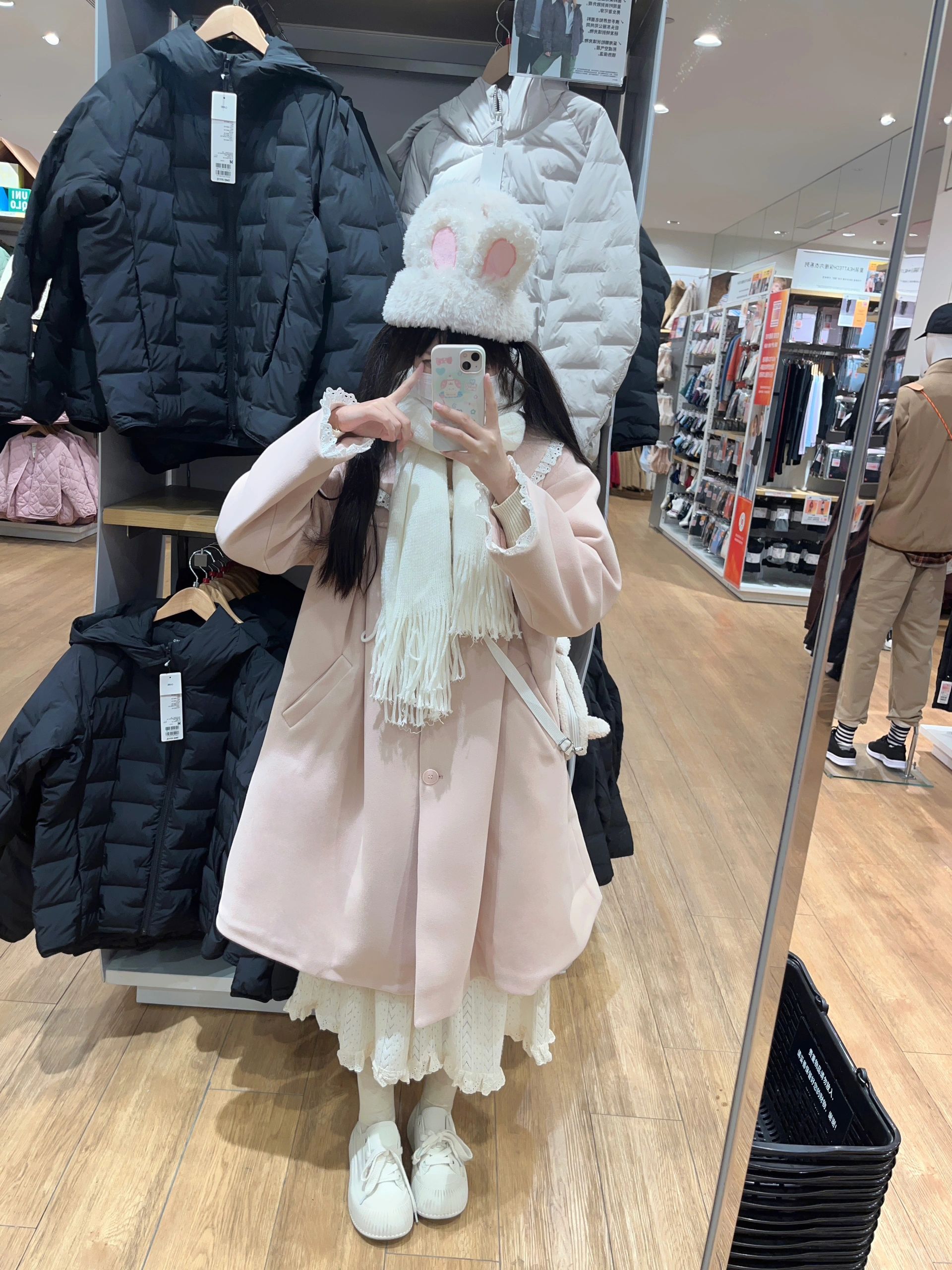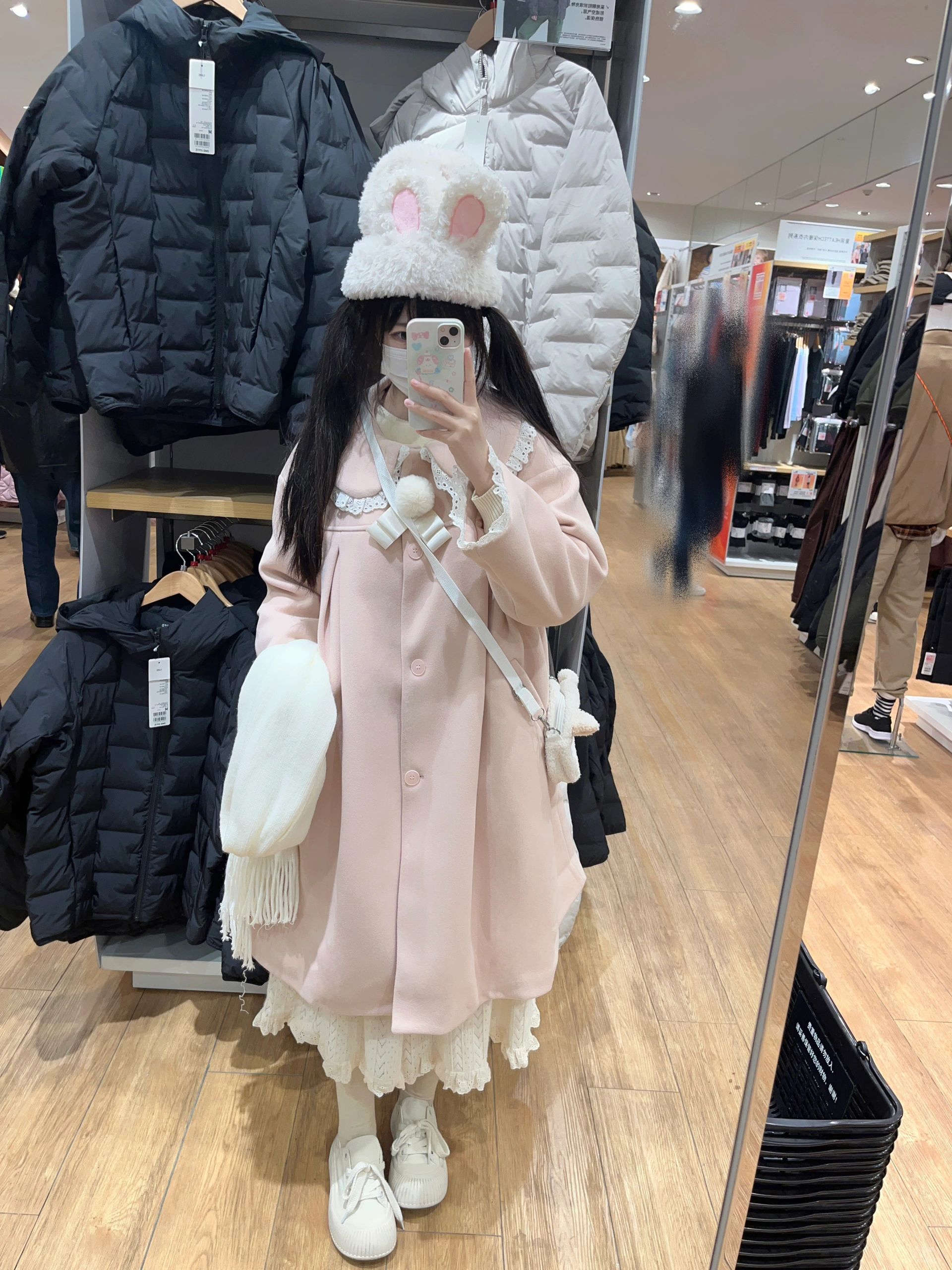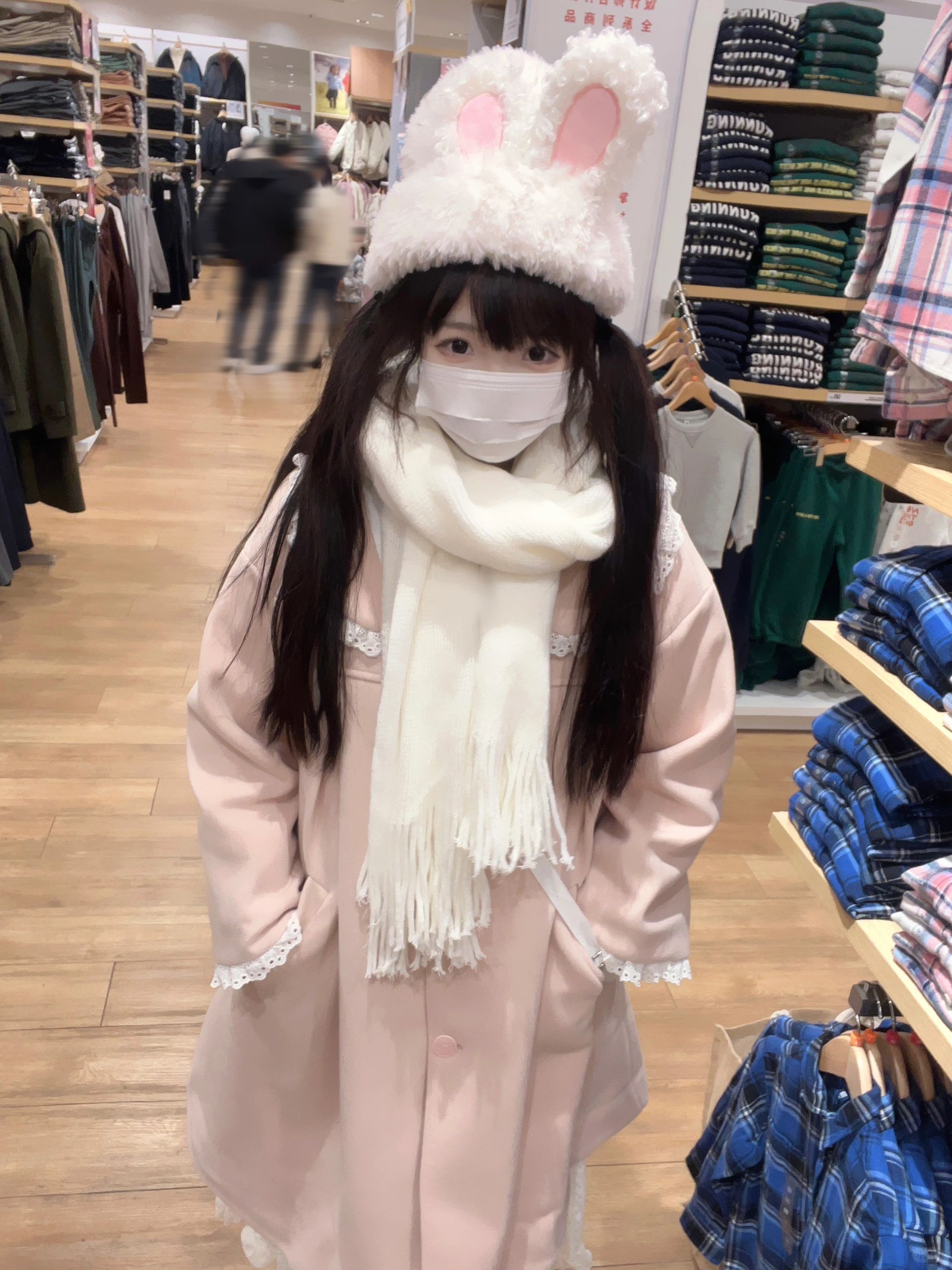 第一次穿粉色的大衣 也太减龄啦! 和新买的兔兔帽很配(ฅωฅ *)
