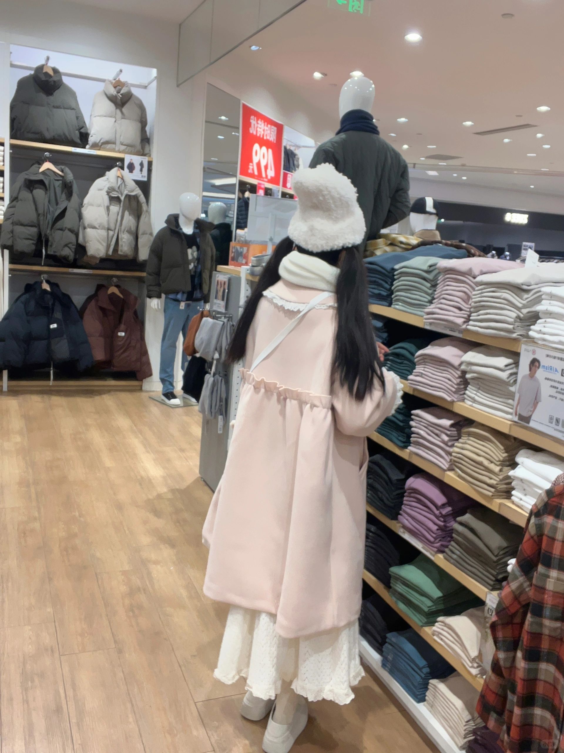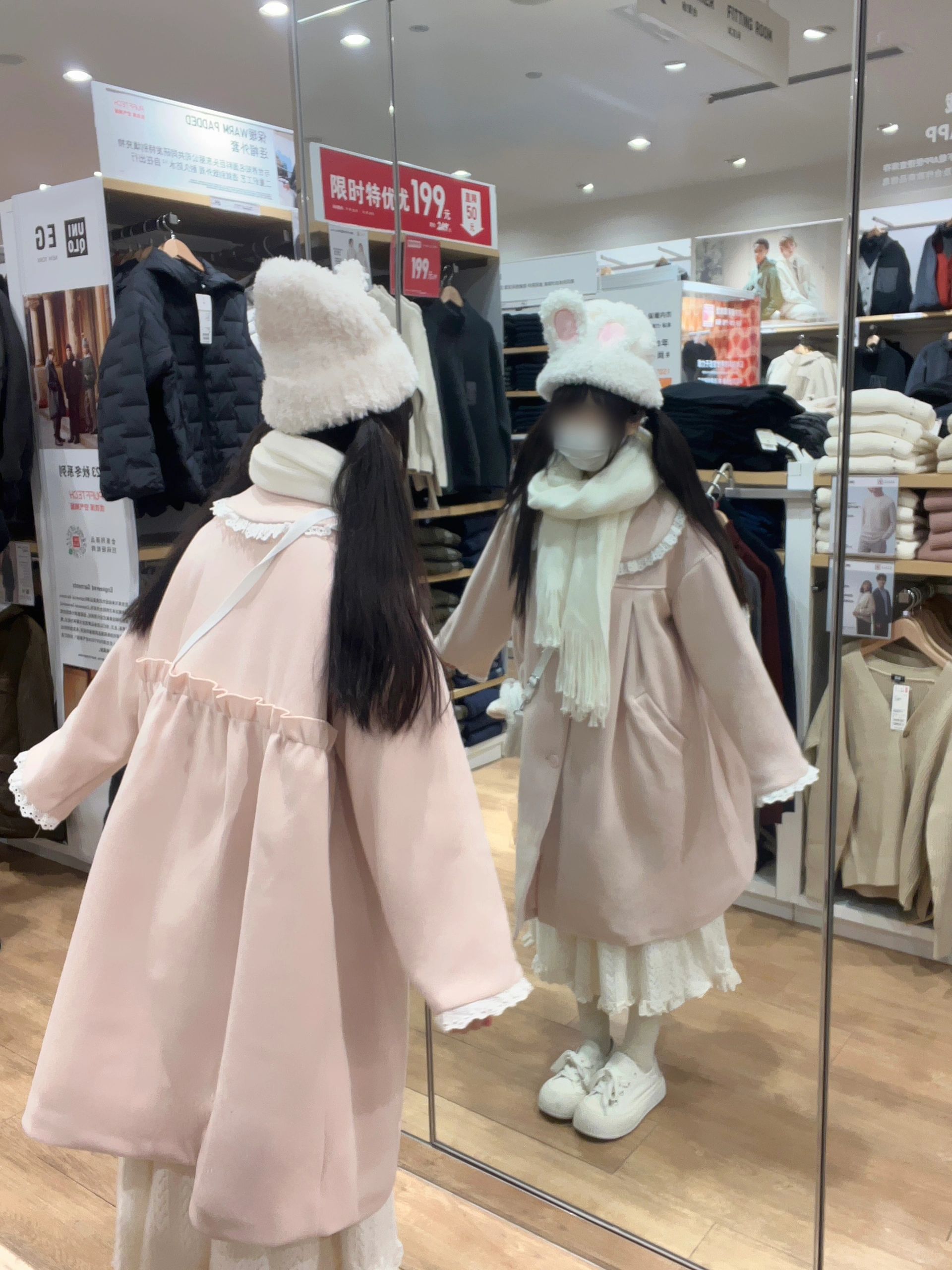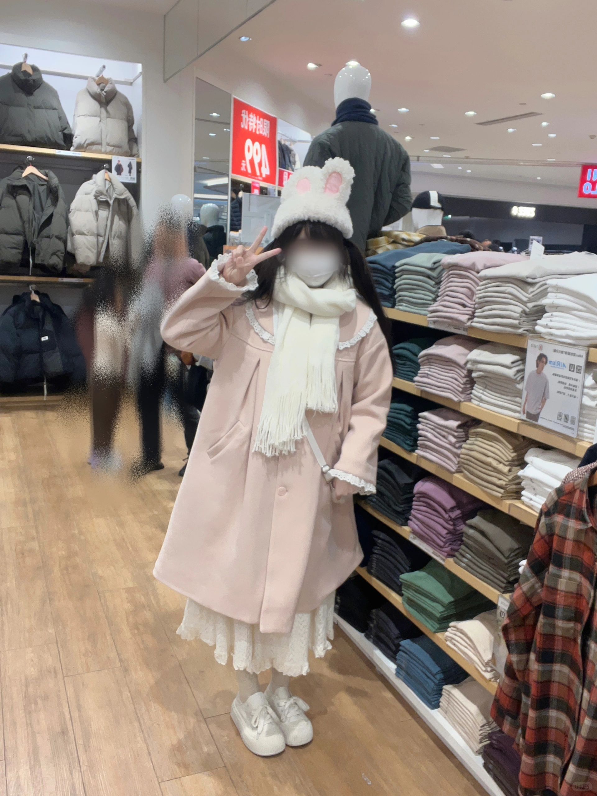 第一次穿粉色的大衣 也太减龄啦! 和新买的兔兔帽很配(ฅωฅ *)