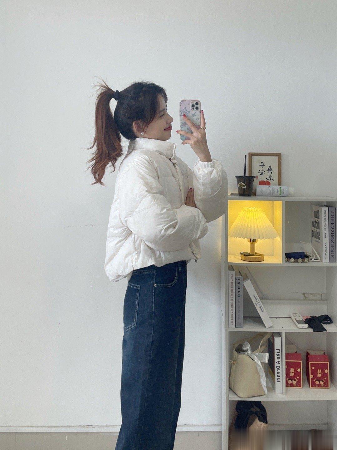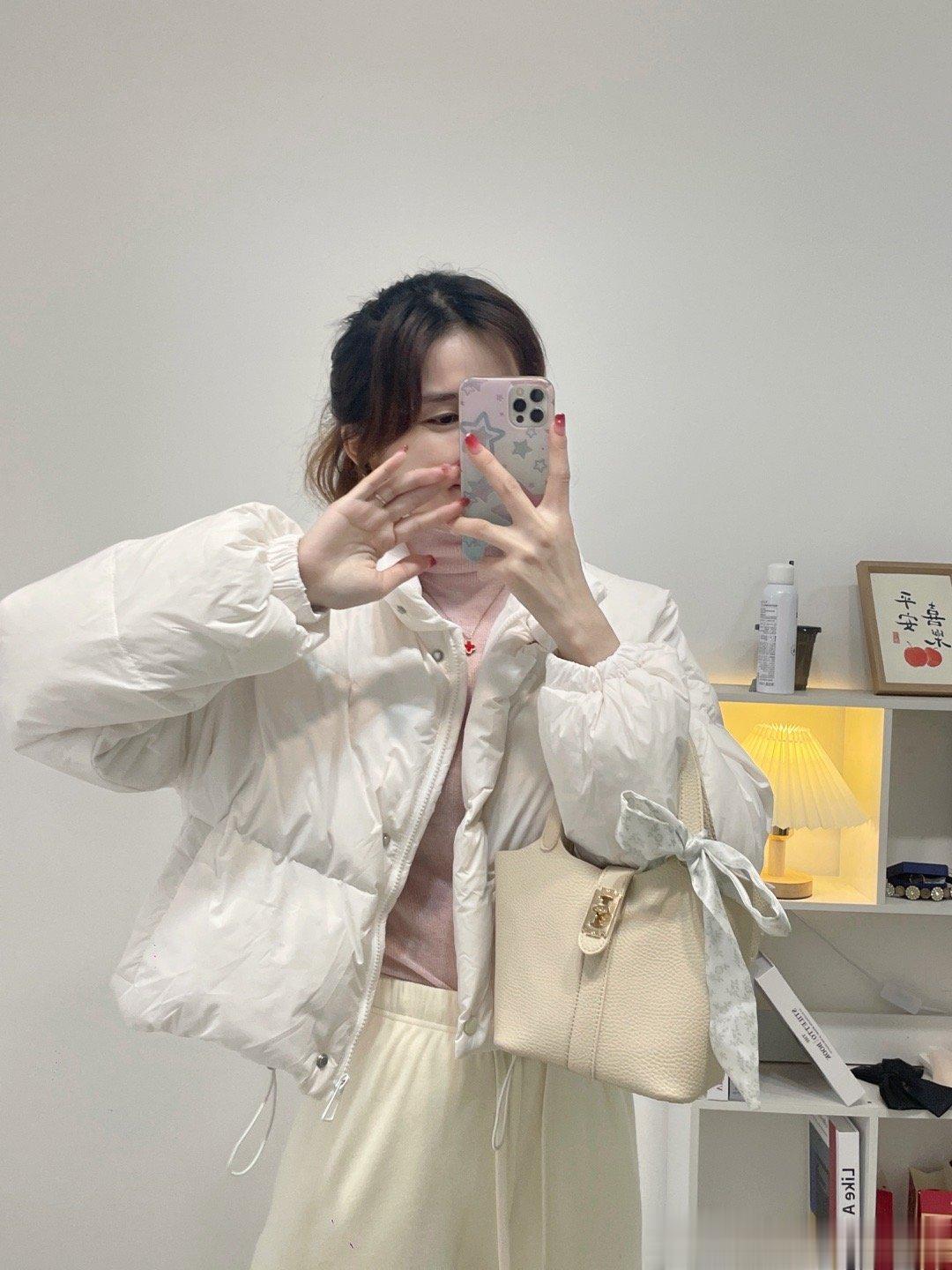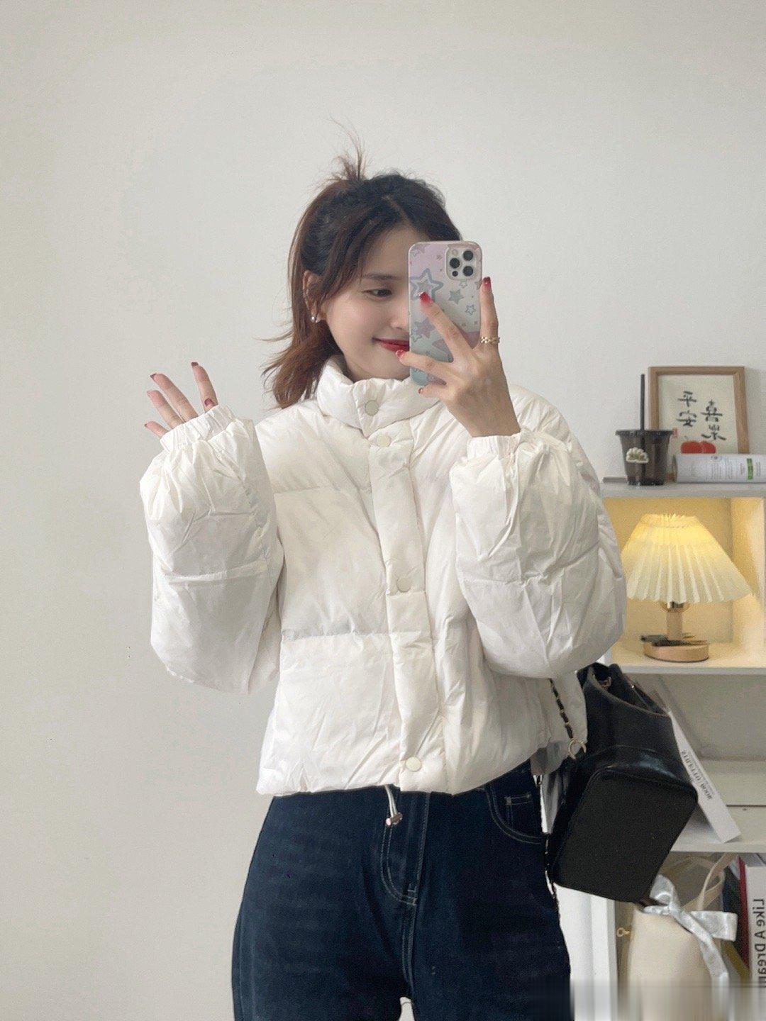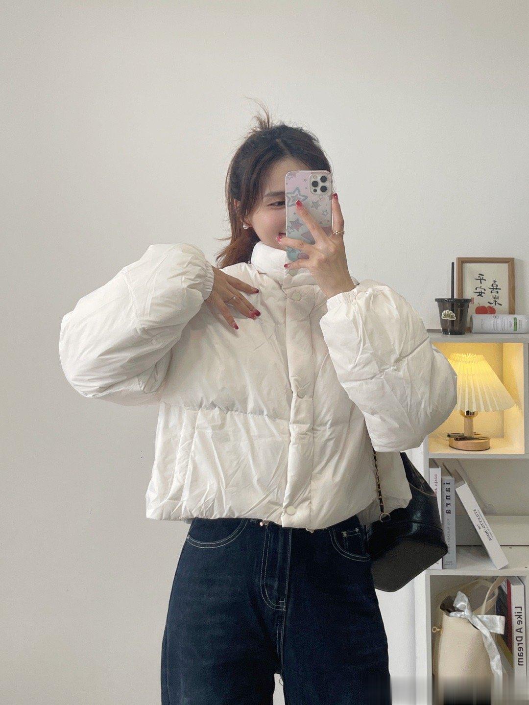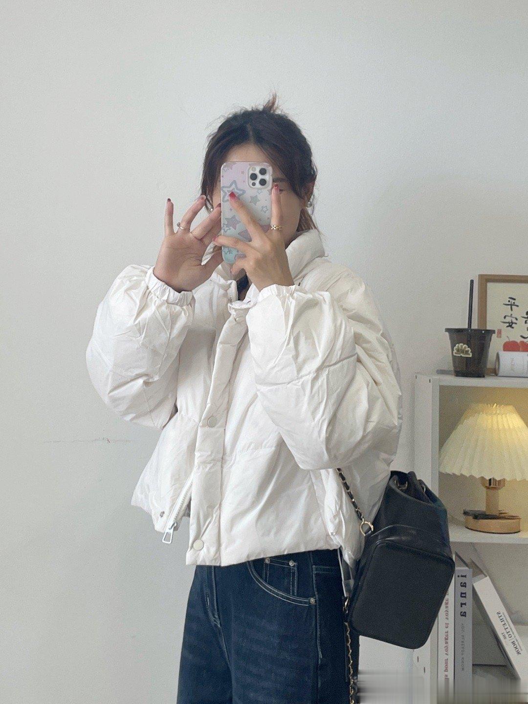 白鸭绒的一件短款羽绒服,拿在手上虽然轻飘飘的,但就是很保暖。不喜欢长款的一定要入短款哦,出门都很方便哦。还有一件藕粉色。
