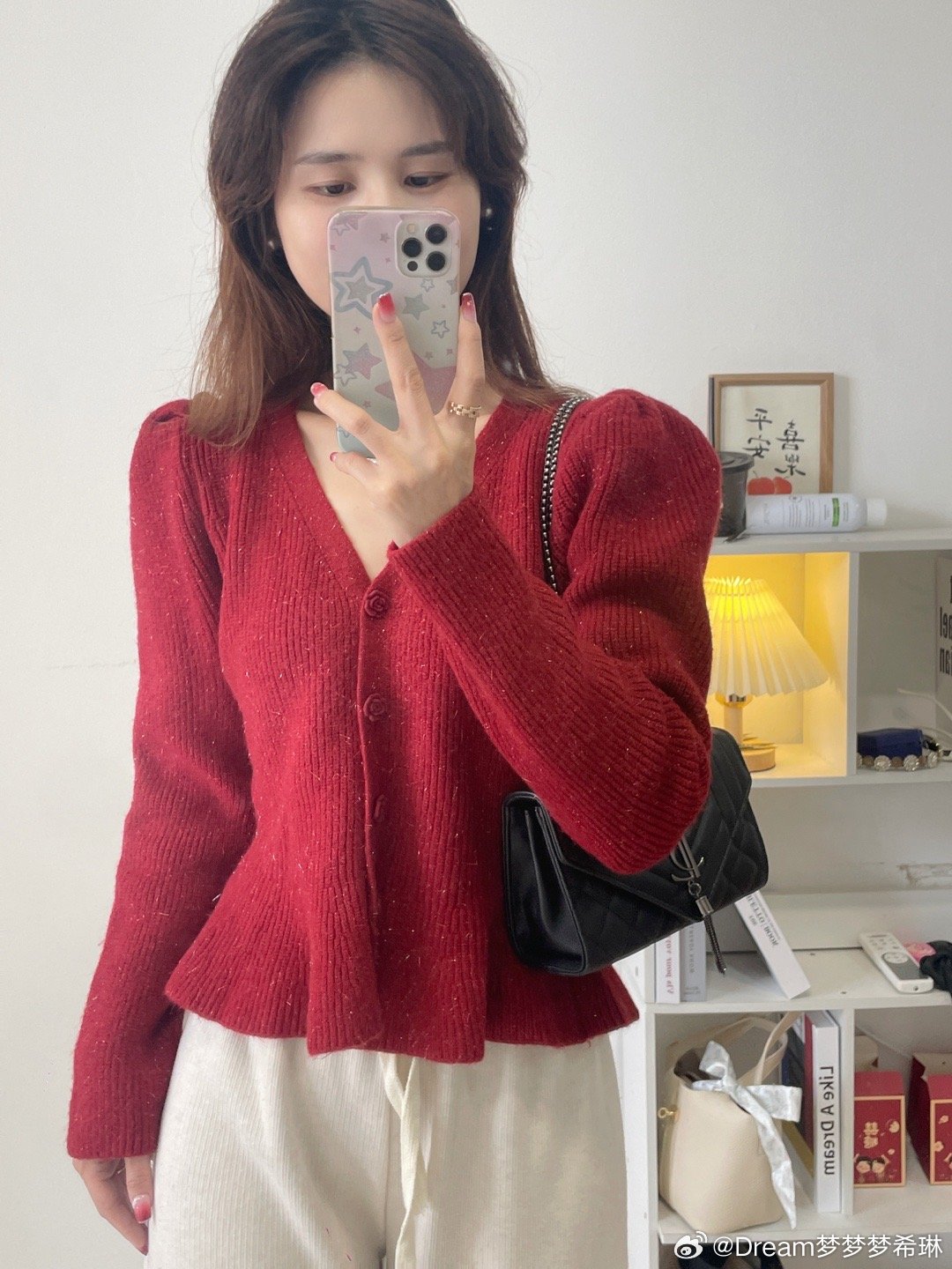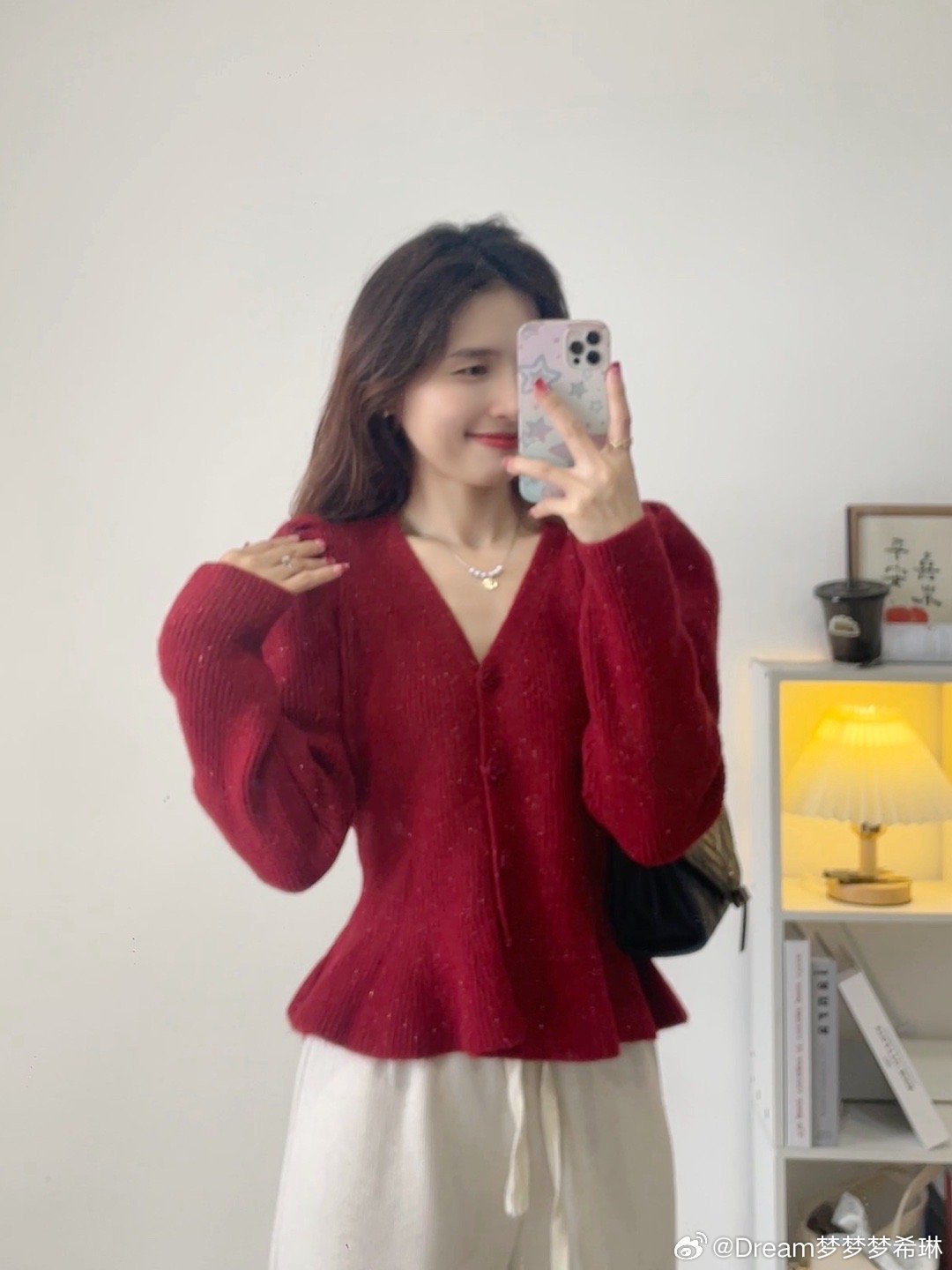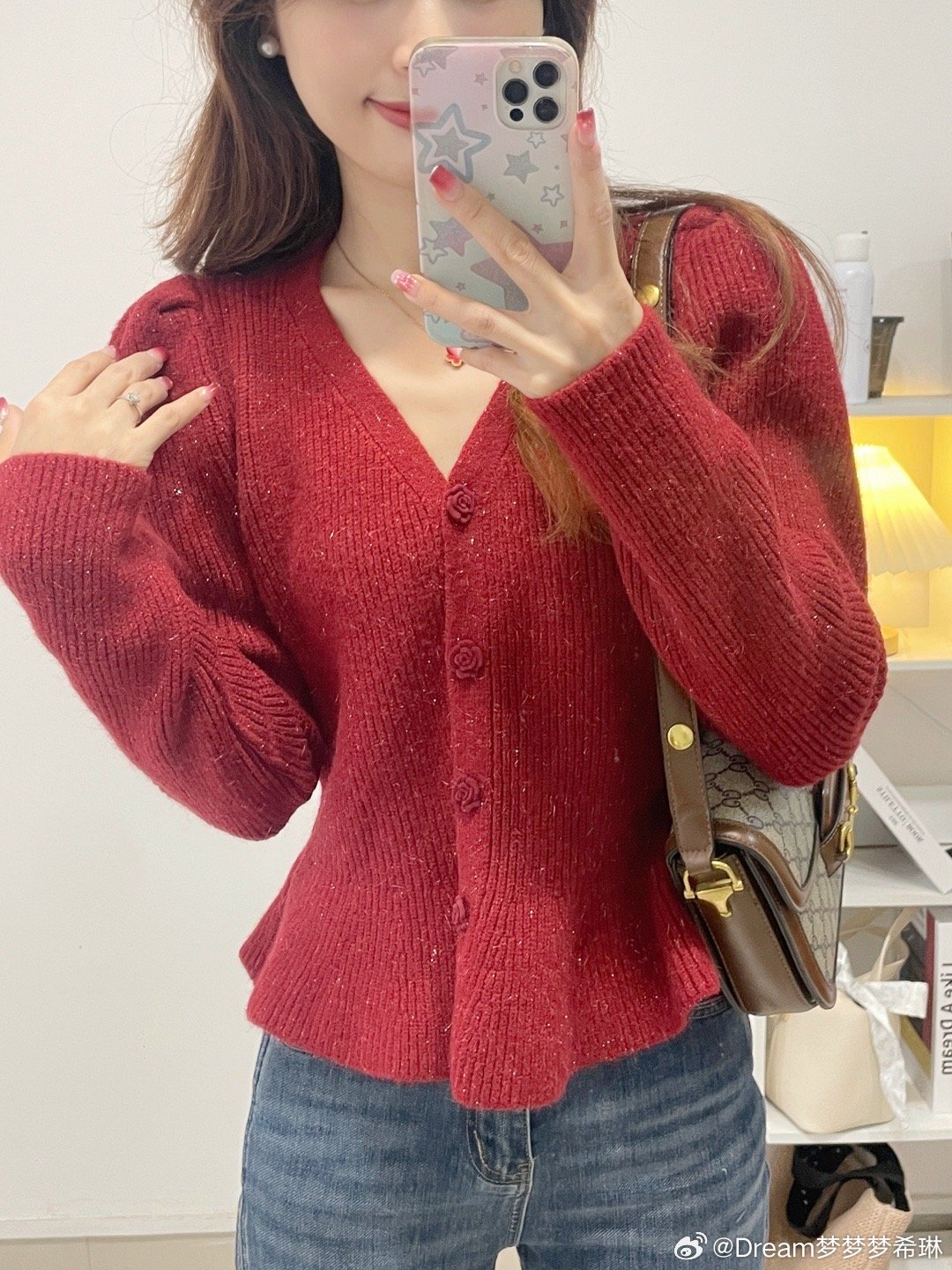 V领收腰的版型,下摆是做的荷叶边下摆,腰部收腰很显腰细,过年时候穿它脱掉大衣,整个亮眼,视觉上就显瘦10斤。扣子是可以解开的哦,微微的泡泡袖。扣子这个真的是绝美!是一个玫瑰扣!敲击精致好看。V领还显得脖子细长,真的很完美这件。