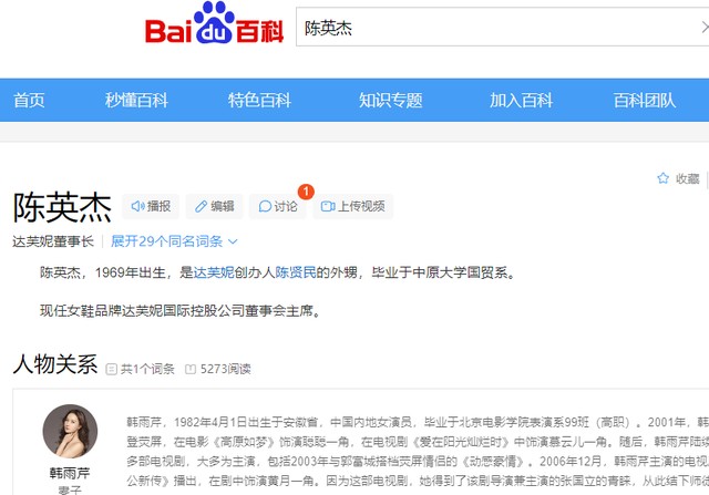 在2010年达芙妮的老板陈英杰与一位明星韩雨芹结婚。