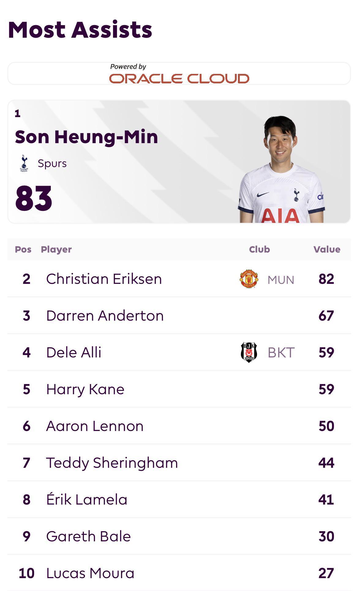 孙兴慜完成了热刺生涯的83次助攻,超越82次的埃里克森,成为热刺英超队史的助攻王。同时,孙兴慜连续8个赛季英超进球上双,在英超历史当中,也只有7个人可以做到这点。