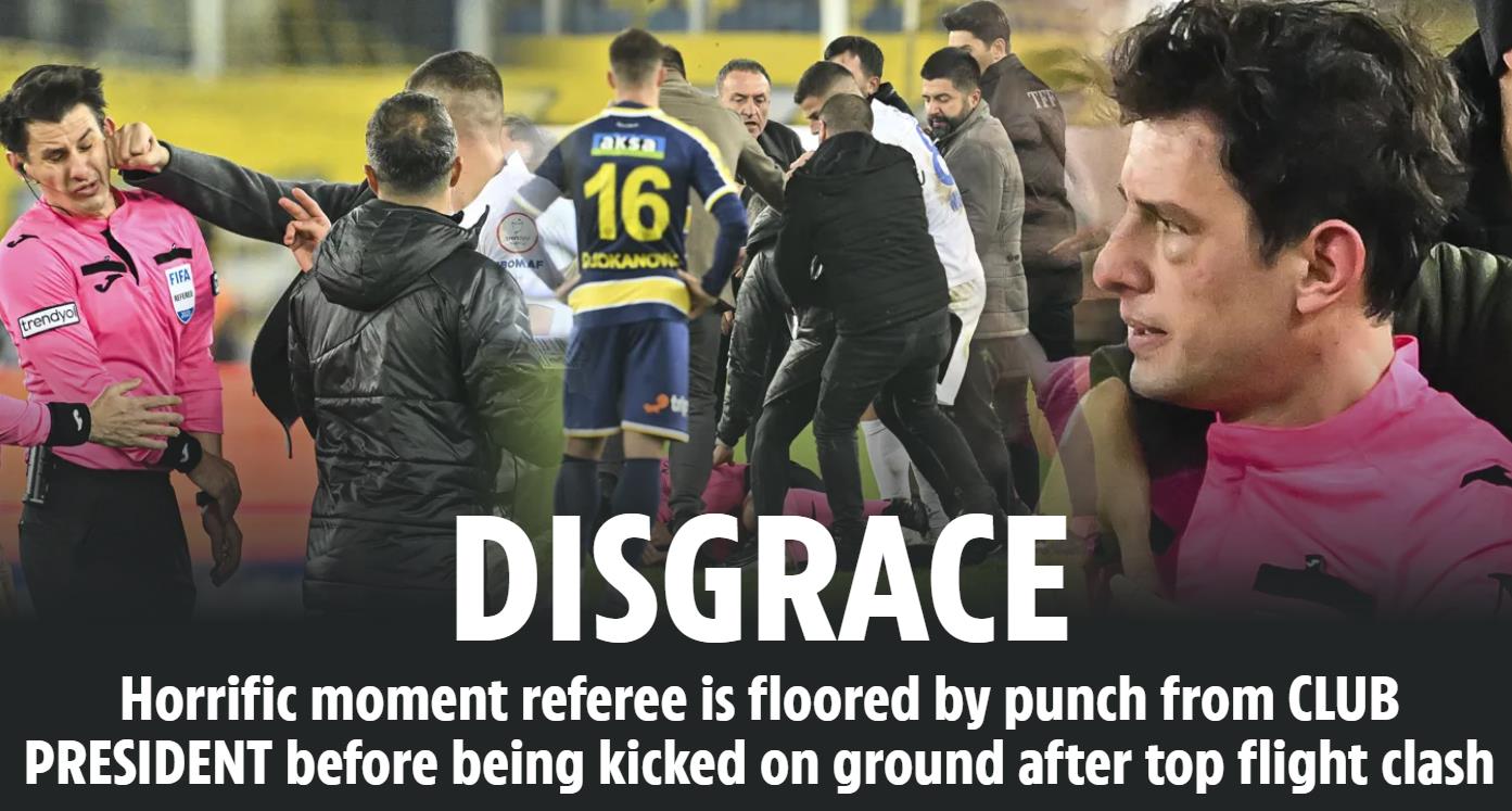【裁判脸上被揍出鸽子蛋了】在土超联赛安卡拉古库对阵里泽体育的比赛中,安卡拉主席科卡因为对裁判梅勒执法不满,直接一记重拳击倒了裁判。随后在混乱中,倒在地上的米勒还被踢了一脚。在安保护送米勒离开球场时,可以看到梅勒眼眶下面被揍出了鸽子蛋大小的包。