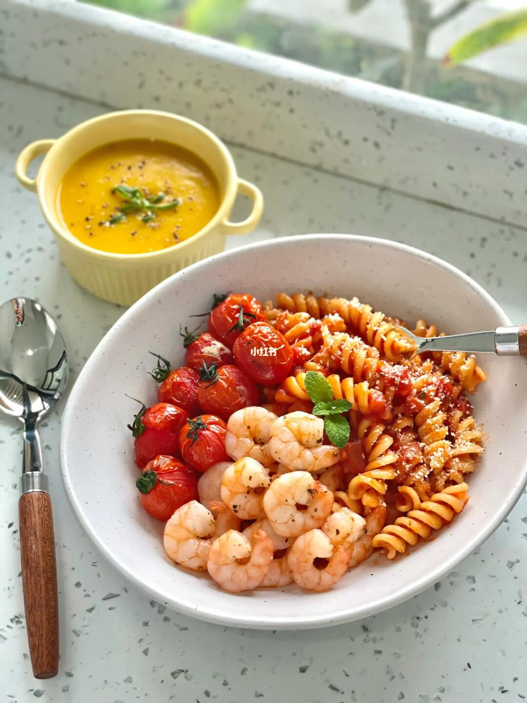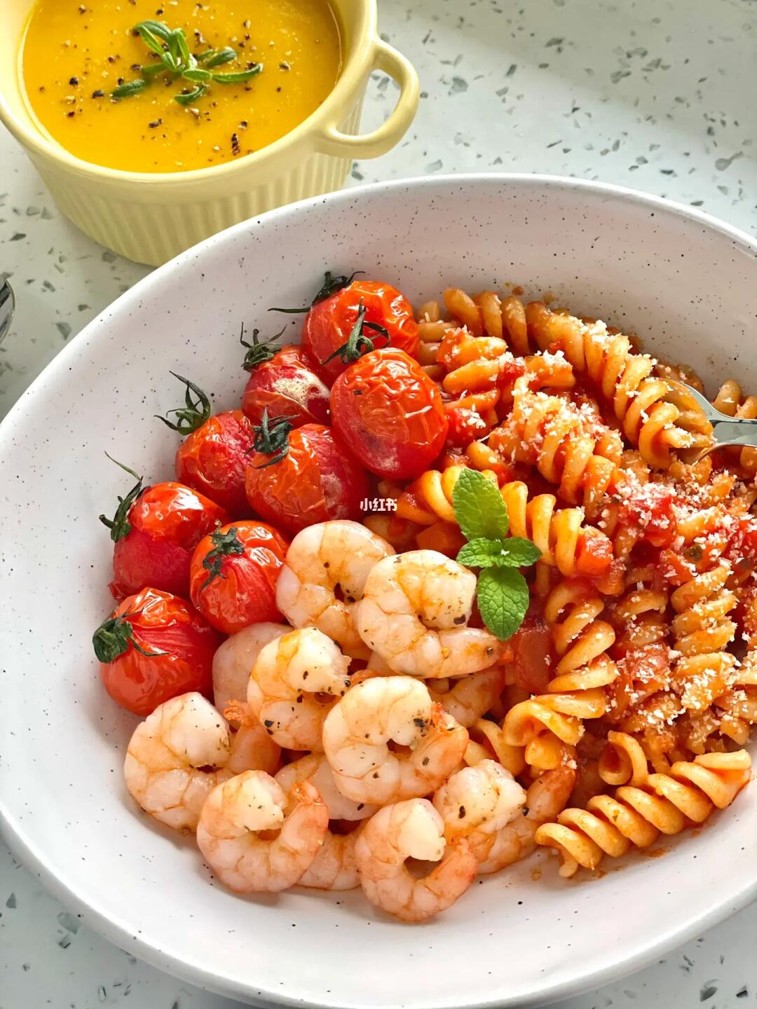 ❤️吃的时候表面撒上咸香的芝士碎,一口罗勒风味意面,一口爆浆圣女果,一口Q弹虾仁。[色色R]