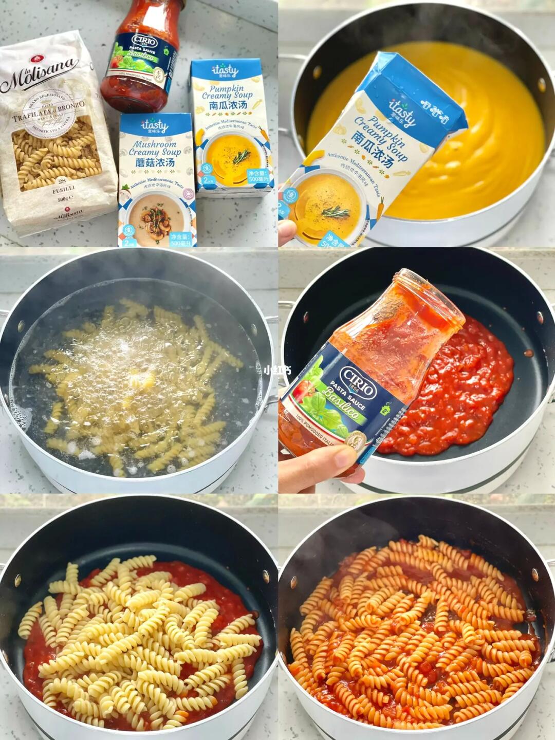 4️⃣锅里倒入茄意欧罗勒风味意大利面酱,加入煮好的意面,小火煮沸即可装盘