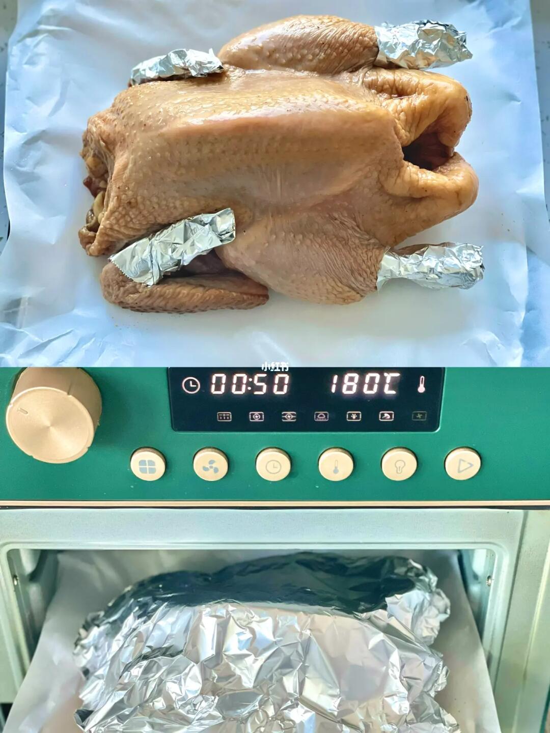 4️⃣烤箱160-180全程烤50分钟,前面的35分钟180度。在全鸡的表面放一层锡纸预防鸡皮过早上色