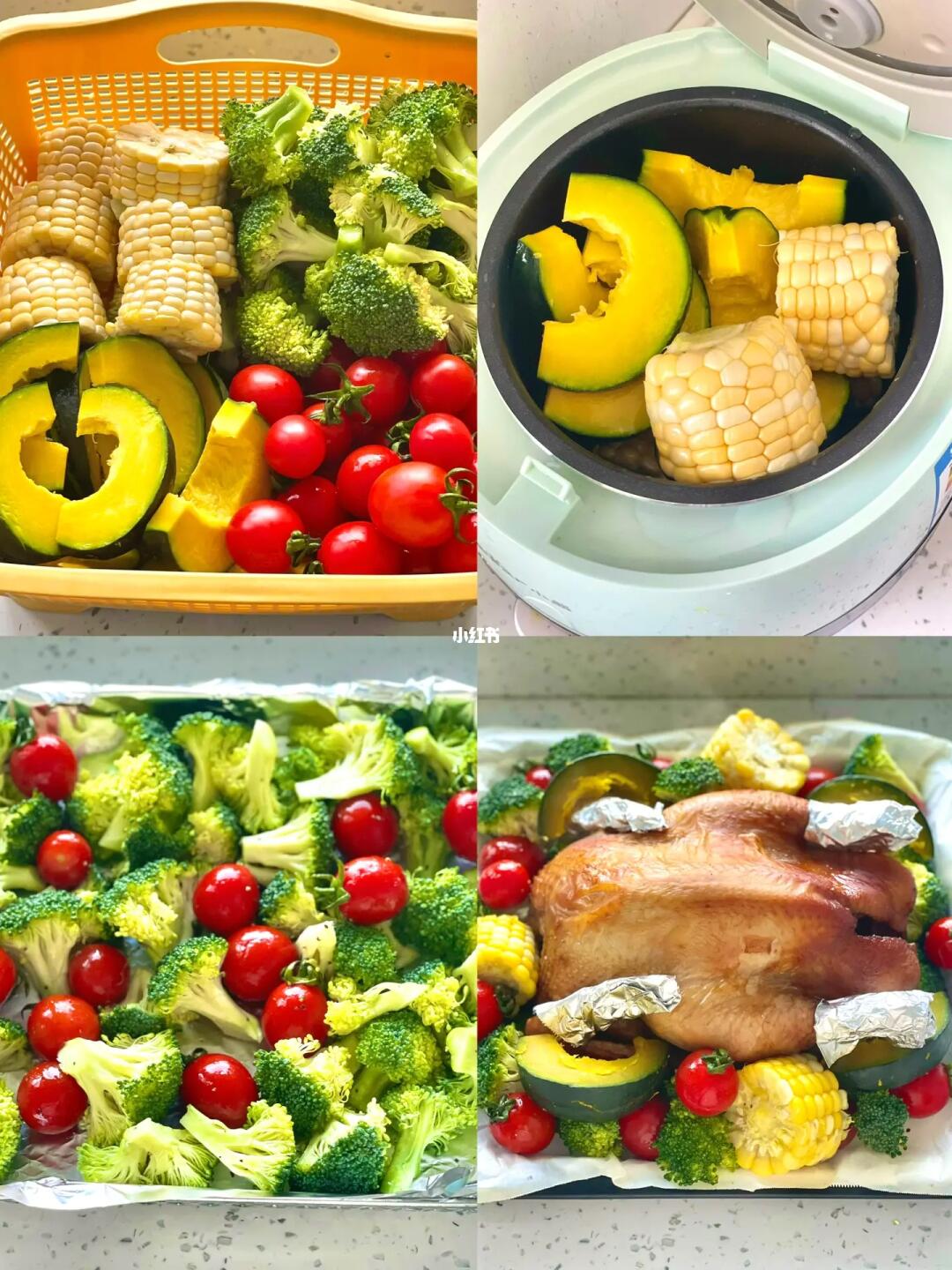 6️⃣全鸡烤到35分钟时从烤箱取出,表面的锡纸取走。把之前准备好的西兰花、圣女果、南瓜、玉米一起放入烤盘中,160度烤15分钟这样就完成啦