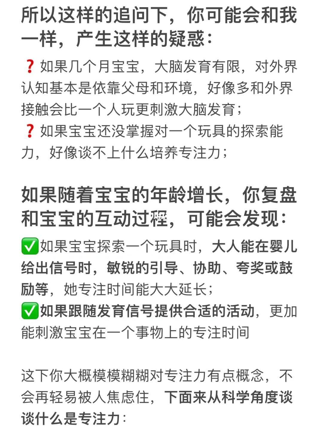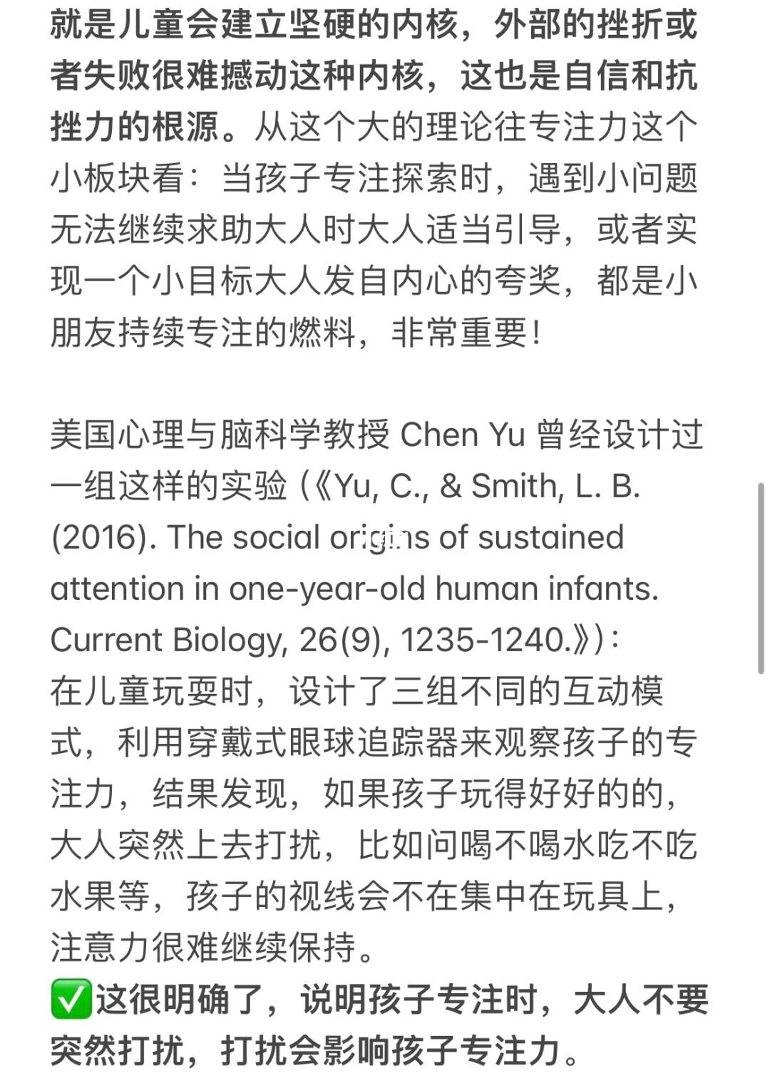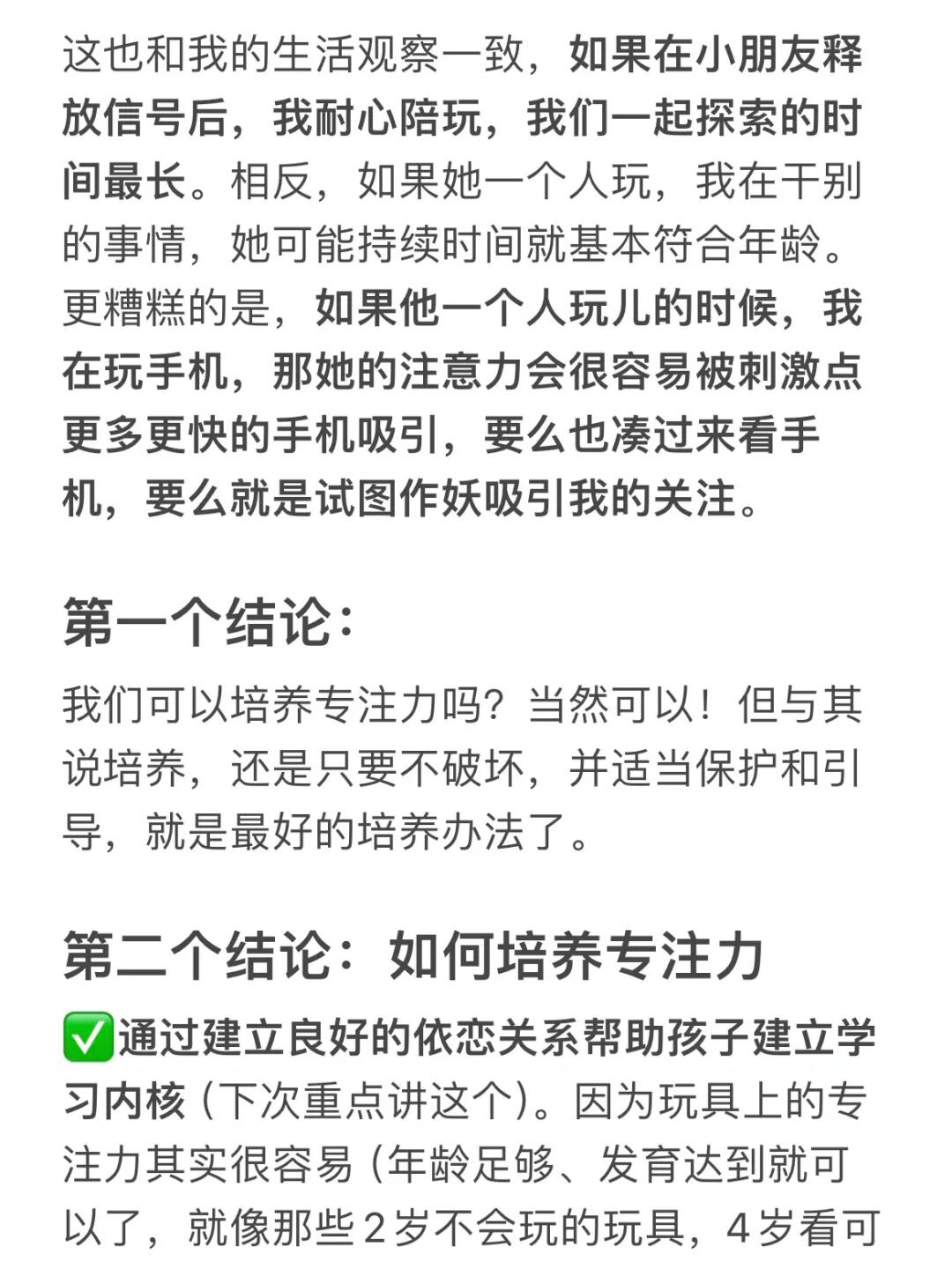 请先阅读上一篇,当然不阅读也可以: 《关于儿童早教我悟了——早教的底层逻辑》 谈到早教好像都会谈到专注力,这似乎也是早教目标的一部分(是吗?),所以我来写写。 其实专注力是随着大脑发育而发育的,是不能超越年龄太多了,当然专注力确实也能被培养,方式其实更多是不打扰就够了。 具体内容看文章吧,最近工作太忙没时间发稿时候就修订错字,一般发布后2-3天我会再重新修一下文章的语序问题和错别字,还请见谅。