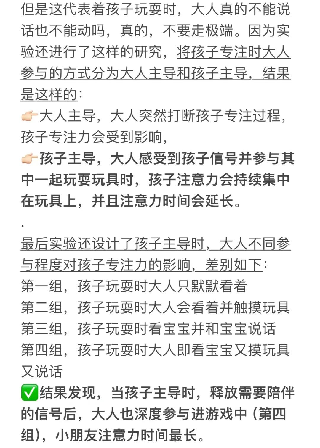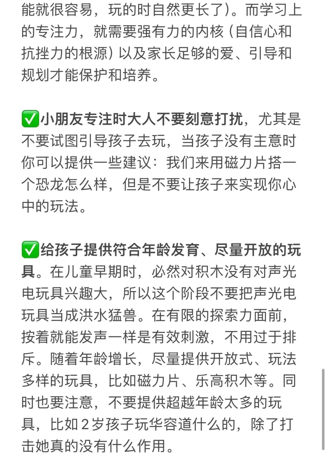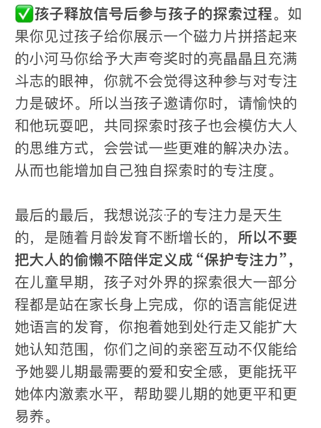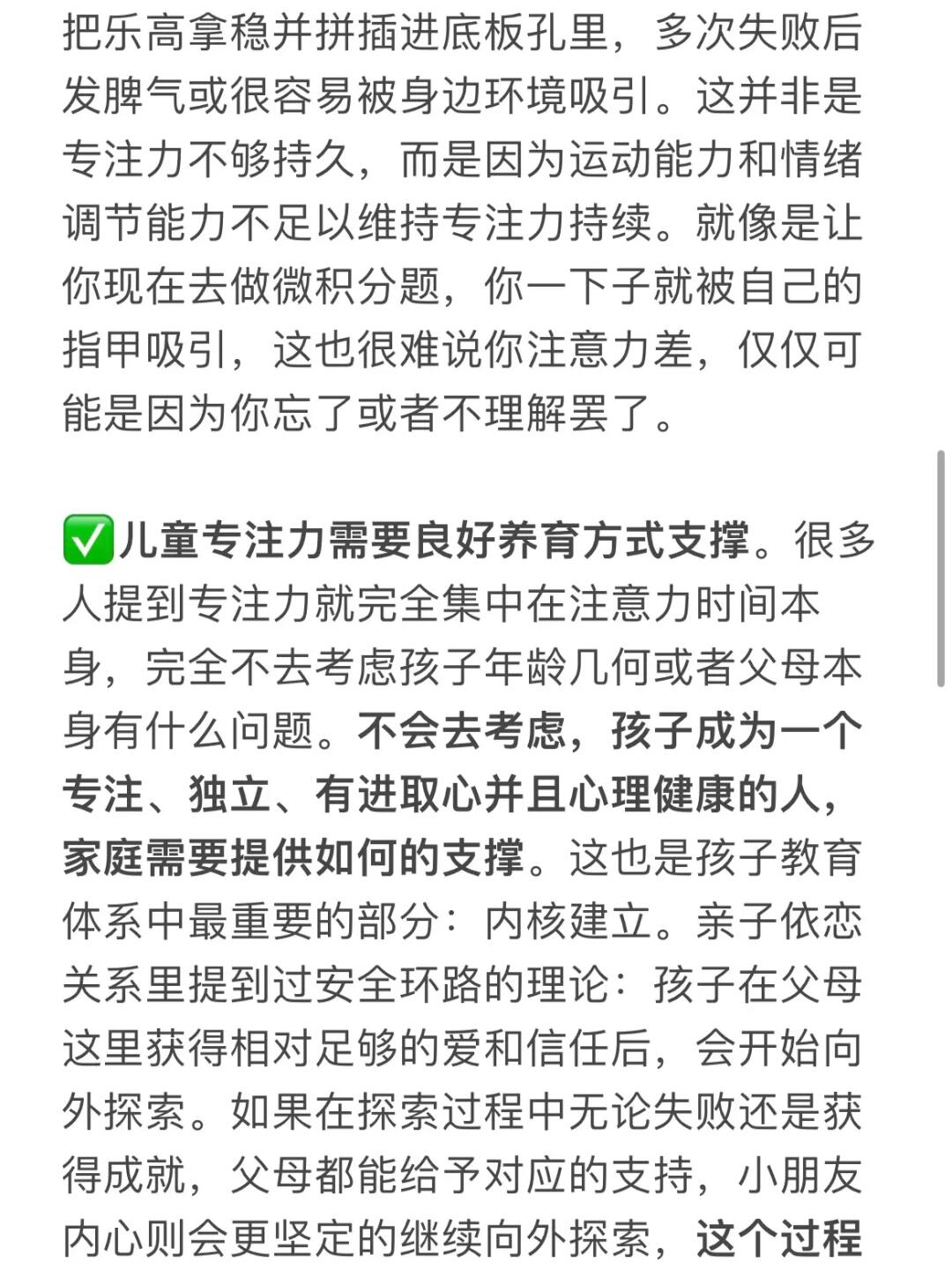 请先阅读上一篇,当然不阅读也可以: 《关于儿童早教我悟了——早教的底层逻辑》 谈到早教好像都会谈到专注力,这似乎也是早教目标的一部分(是吗?),所以我来写写。 其实专注力是随着大脑发育而发育的,是不能超越年龄太多了,当然专注力确实也能被培养,方式其实更多是不打扰就够了。 具体内容看文章吧,最近工作太忙没时间发稿时候就修订错字,一般发布后2-3天我会再重新修一下文章的语序问题和错别字,还请见谅。