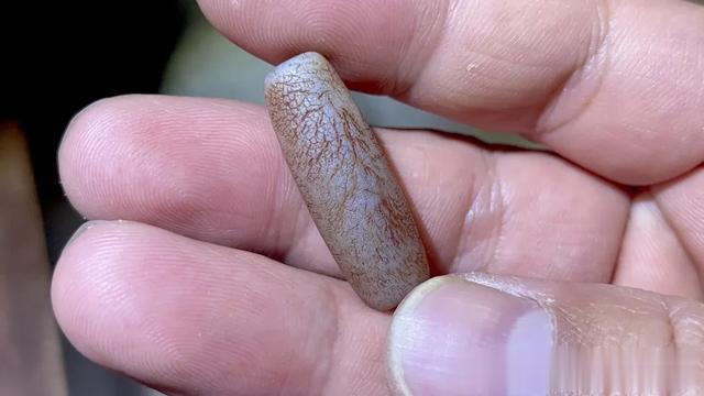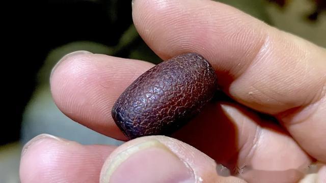 大开门老糖管老玛瑙珠子,满橘皮风化纹,一眼老的珠子。黑里透红,打光也是透红光。