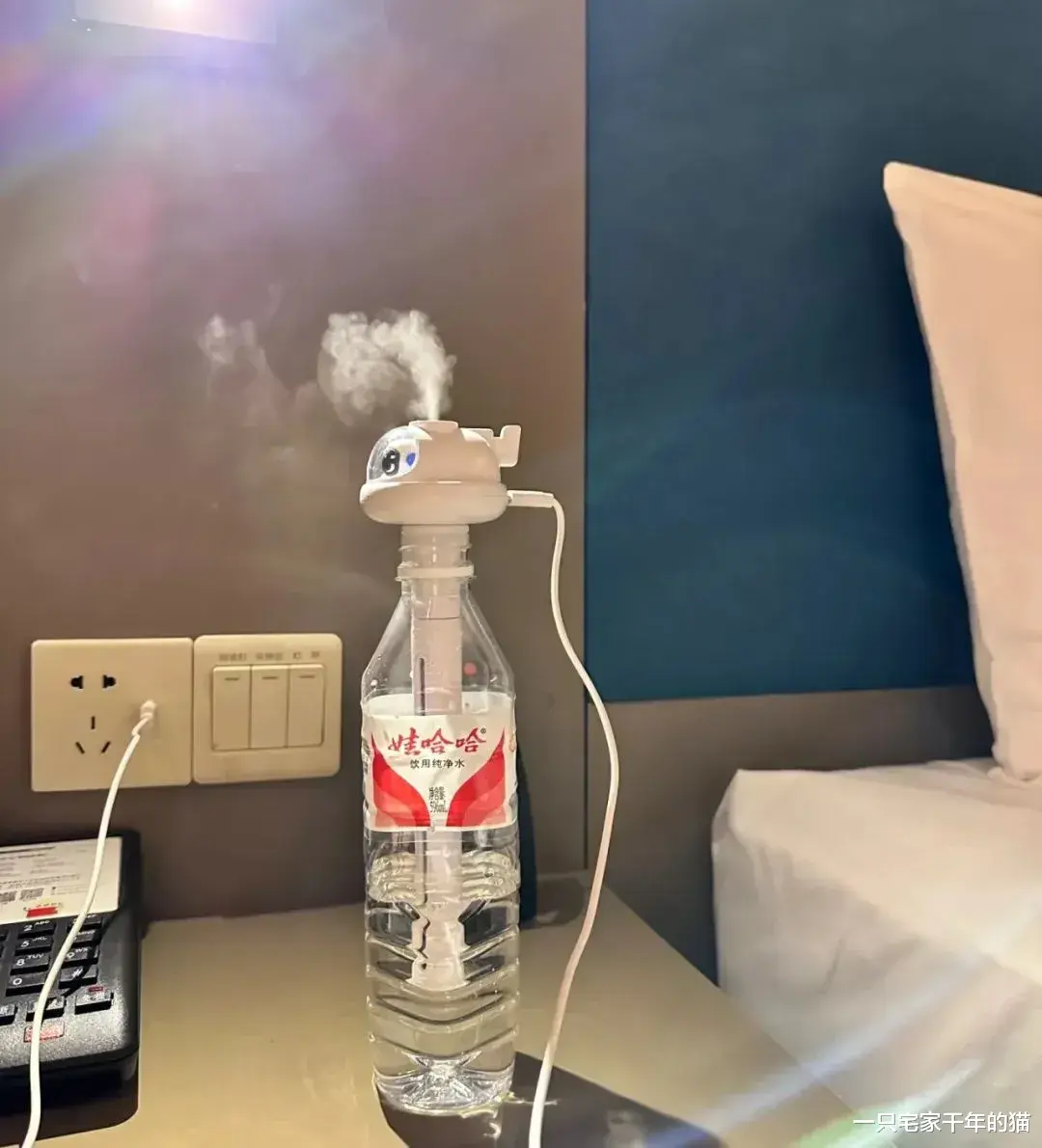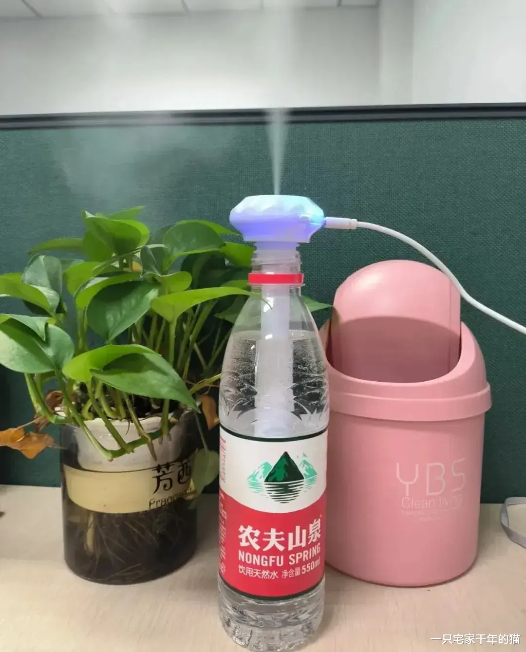 它价格很便宜,只要几十块,没有配水箱,只有一个加湿器喷头。这个喷头的口径可以适配常规的矿泉水瓶,等于水箱是一次性的,根本不存在长期不清理滋生细菌的情况,特别是在干燥的冬天,空调房里面,即使给小孩子用都放心。