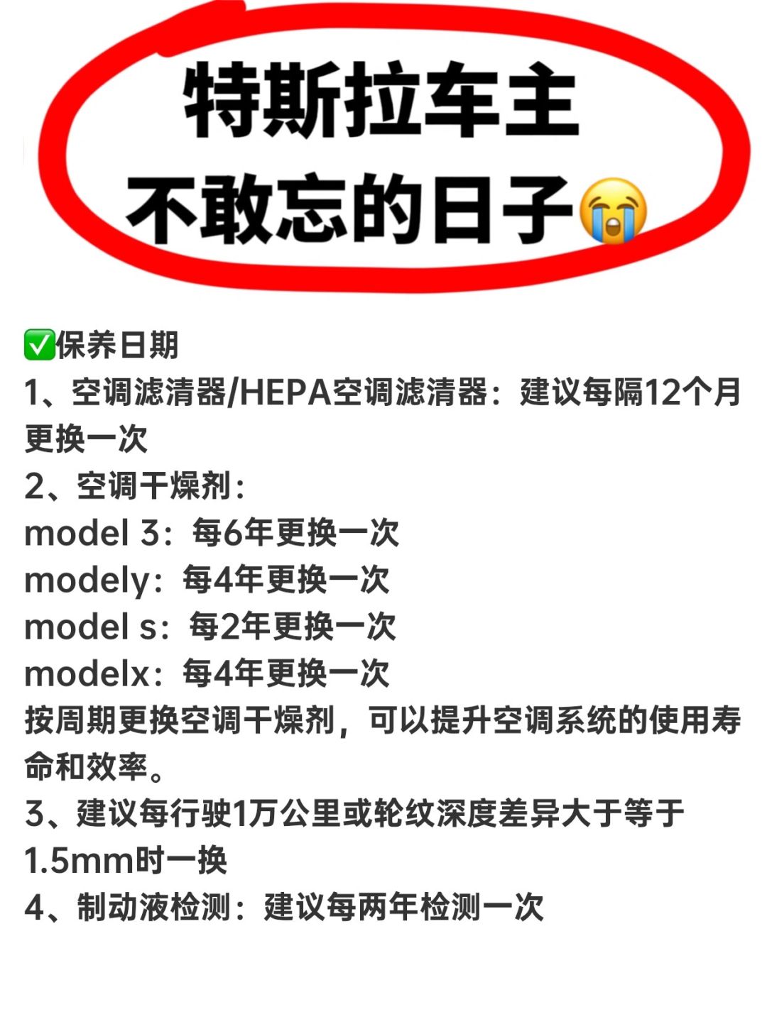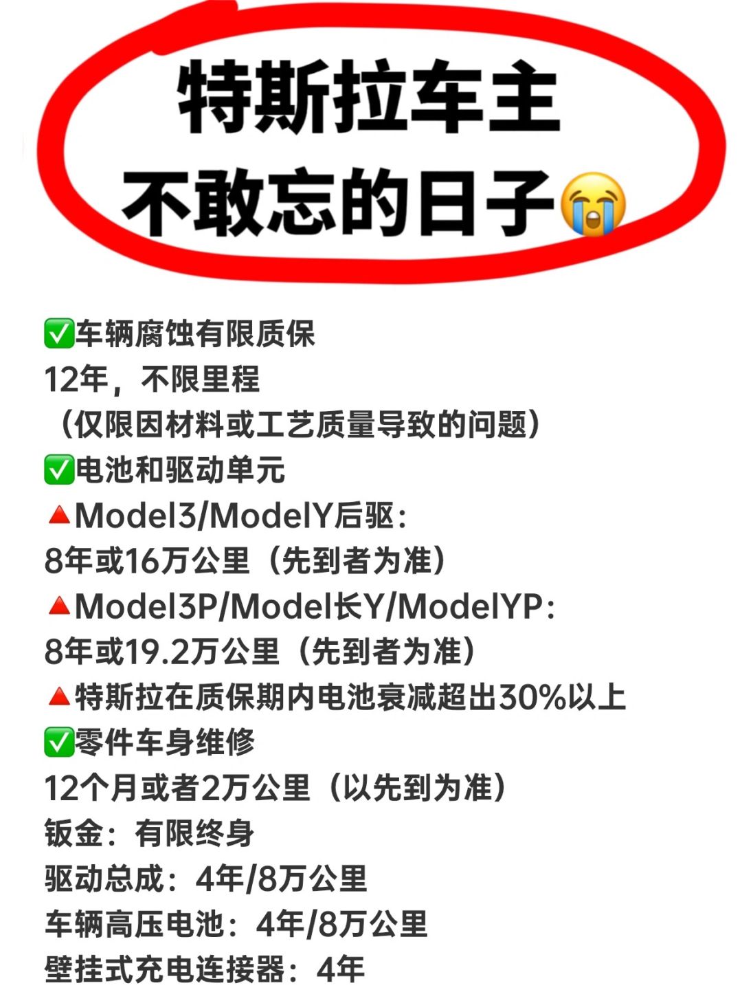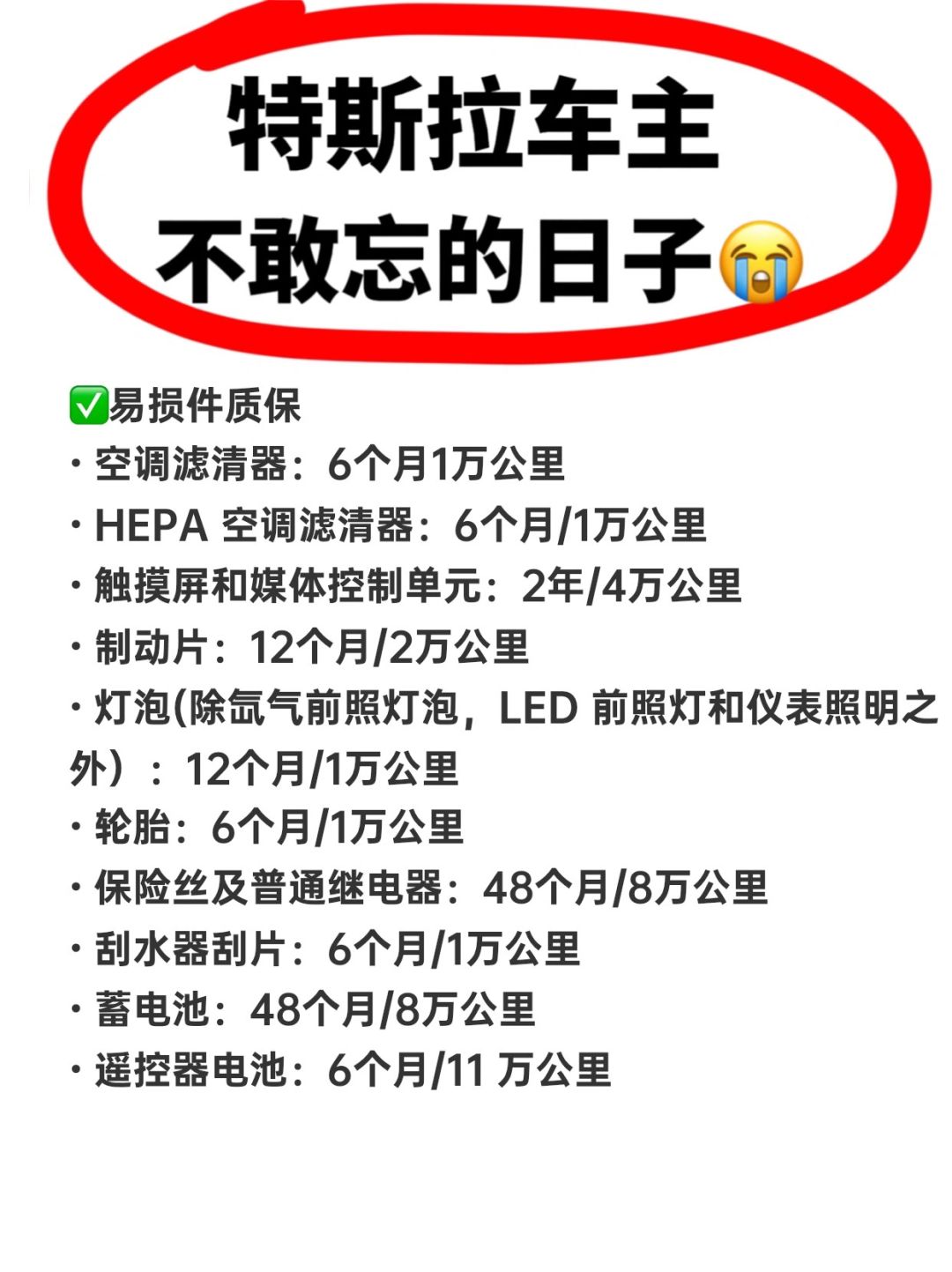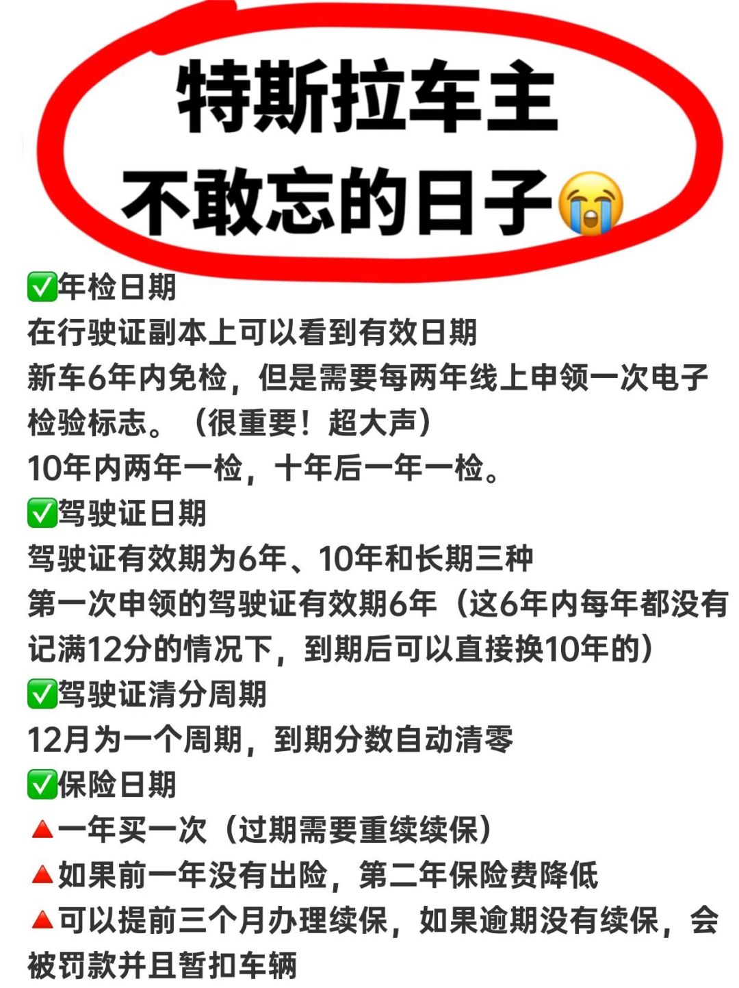 ✅整车质保 ✅新车质保 ✅二手车有限质保 ✅延长质保 ✅座椅、安全带和气囊系统 ✅车辆腐蚀有限质保 ✅电池和驱动单元 ✅零件车身维修 ✅易损件质保 ✅年检日期 ✅驾驶证日期 ✅驾驶证清分周期 ✅保显日期 ✅保养日期 ㊙️tips 特斯拉官方服务中心的车辆技术检查是🆓的哦,包括底盘轮胎、刹车卡钳、电池健康等项目,车友们该薅的羊毛记得薅哦 - 关㊗️我,你真的很会开特斯拉! -