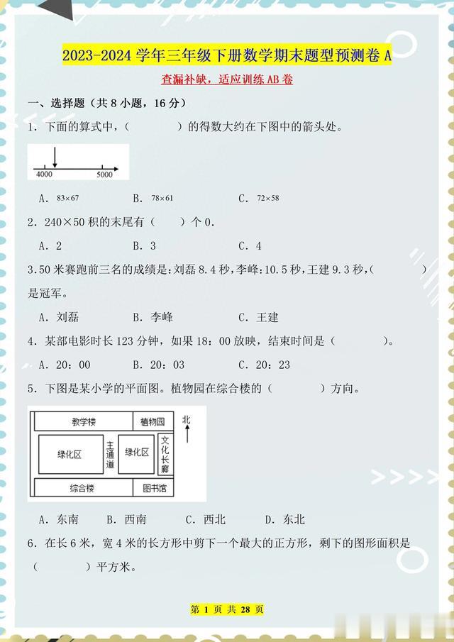 考前必刷:2023-2024学年三年级下册数学期末题型预测卷,附答案