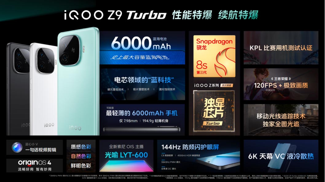 iQOO Z9系列今日发布,又一款中端旗舰手机面世。这个系列的手机有哪些亮点呢?1、极致性能:iQOO Z9 Turbo搭载了先进的第三代骁龙8s移动平台,与独显芯片Turbo搭档,实现了前所未有的超强性能2、创新散热:随着性能的突破,散热成为关键。iQOO Z9 Turbo采用了6K天幕VC液冷散热系统和iQOO史上最大面积的均热板,保证了设备即使在高负荷运行时也能保持稳定。不多说,这又是一款诚意十足的游戏手机。3、强大电池:iQOO Z9全系配备了6000mAh超大容量电池,借助蓝海电池技术和智能的功耗管理,可实现超强的续航能力。无论是长时间的游戏还是外出旅行,用户都无需担心电量问题。4、精致设计:在保持轻薄的同时,iQOO Z9系列采用了金属舷窗设计和星轨刻度纹理,展示了旗舰级别的工艺美学。舒适的握持感和精致的外观,让人一见倾心。5、护眼屏幕:iQOO Z9 Turbo与iQOO Z9采用了144Hz超高刷新率的华星C8屏幕,结合SGS低蓝光和低频闪认证,为用户带来丝滑般视觉享受的同时,也提供了全方位的眼部保护。6、智能系统:iQOO Z9系列将搭载全新OriginOS 4.0,提供超过700种手机相关功能和AI服务,让用户体验更加智能、便捷。7、普及价位:旗舰级的配置和性能加持,但iQOO Z9系列的价格却非常亲民。iQOO Z9 Turbo的价格为1999元起,iQOO Z9的价格为1499元起,iQOO Z9x价格为1199元起。