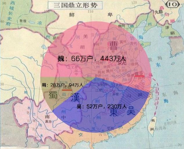 小时候读三国时,很疑惑,从地图上看(图一),吴蜀的地盘加起来比曹魏要大得多,怎么会说曹魏“三分天下有其二”呢? 直到看完三国的人口数量(图二),以及那会儿的人口密度分布图(图三),我才明白,人家曹魏还真的是有其二,吴国也还可以,蜀国确实弱得可以。 这也从侧面反映出,诸葛武侯北伐时双方的兵力对比之悬殊。