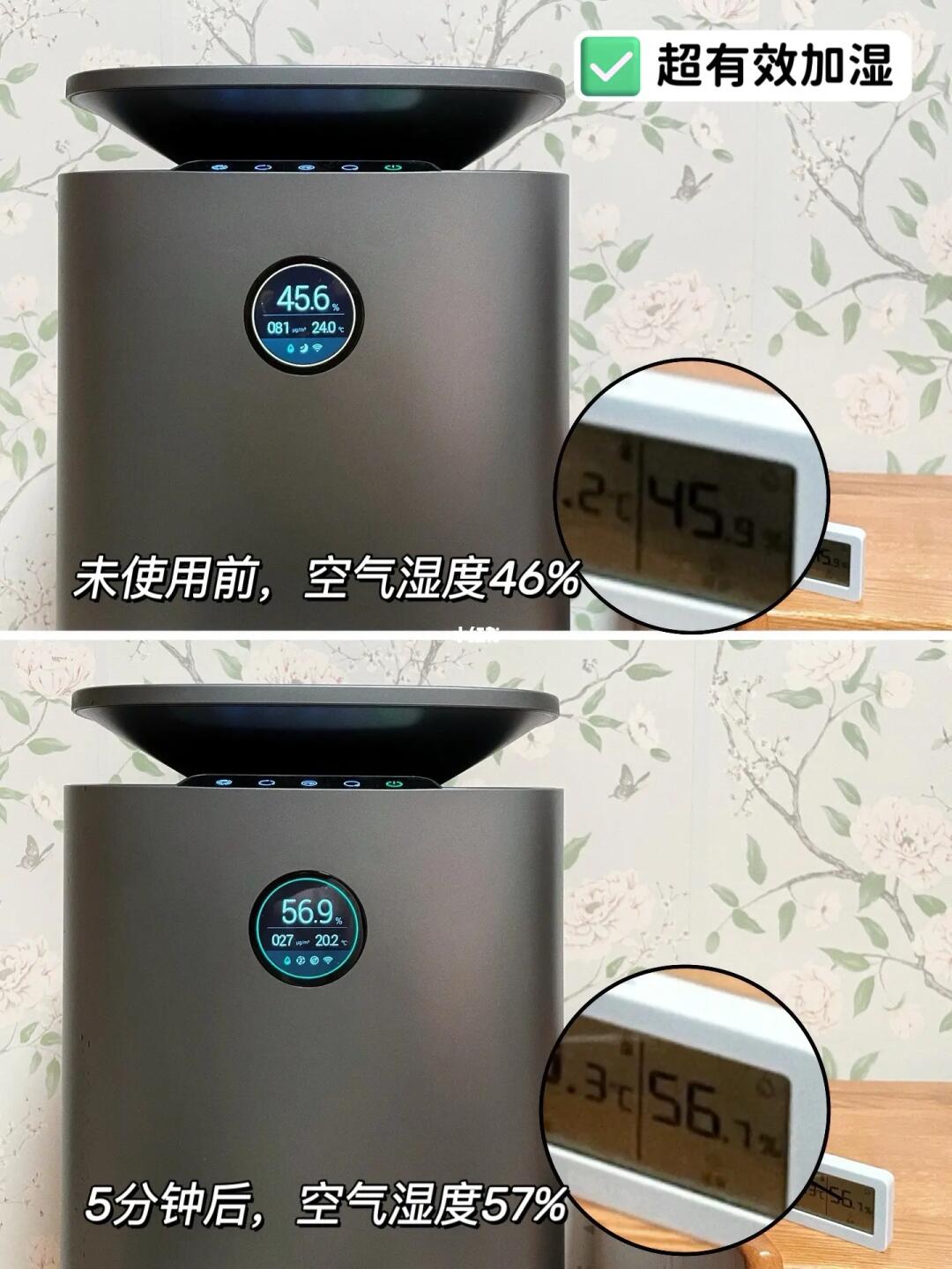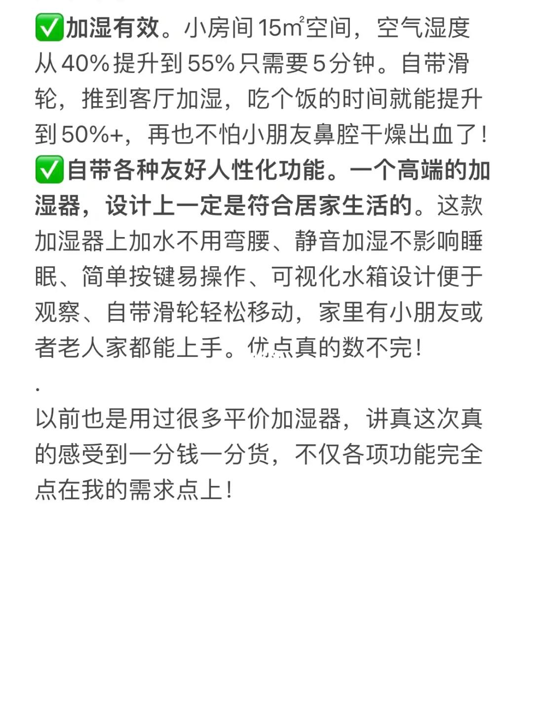 ✅加湿有效。拥有2500ml/h的加湿量,效率很高,我家小房间约15㎡空间,空气湿度从40%提升到55%只需要5分钟,而且自带滑轮,推到客厅加湿最多半小时也能将湿度维持在舒适值,再也不怕小朋友鼻腔干燥出血了!