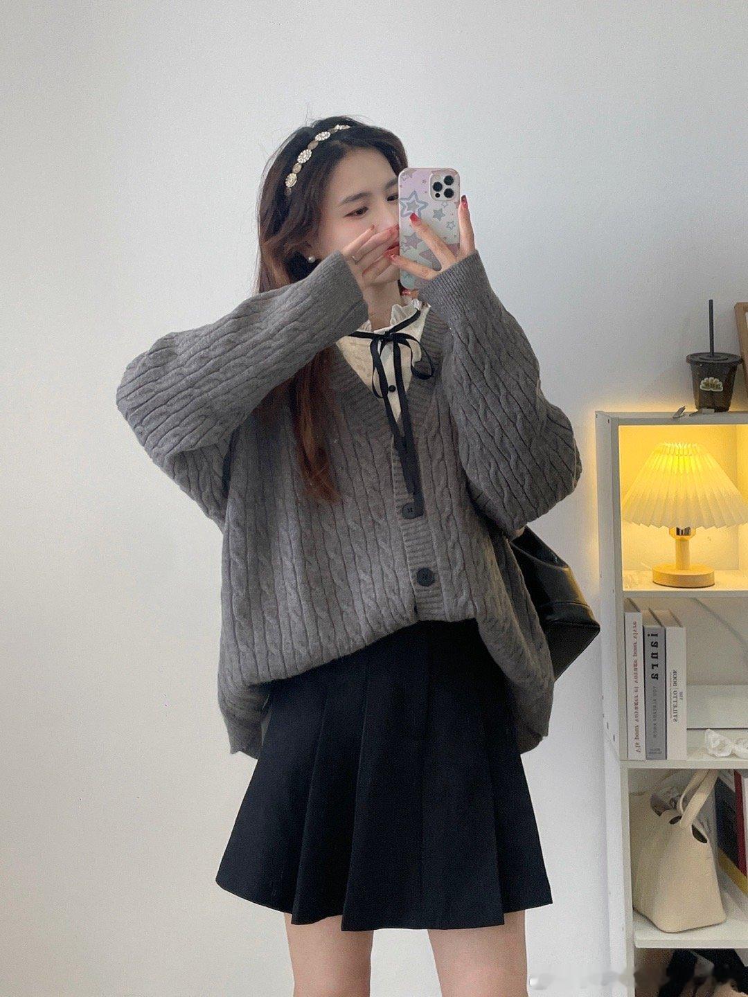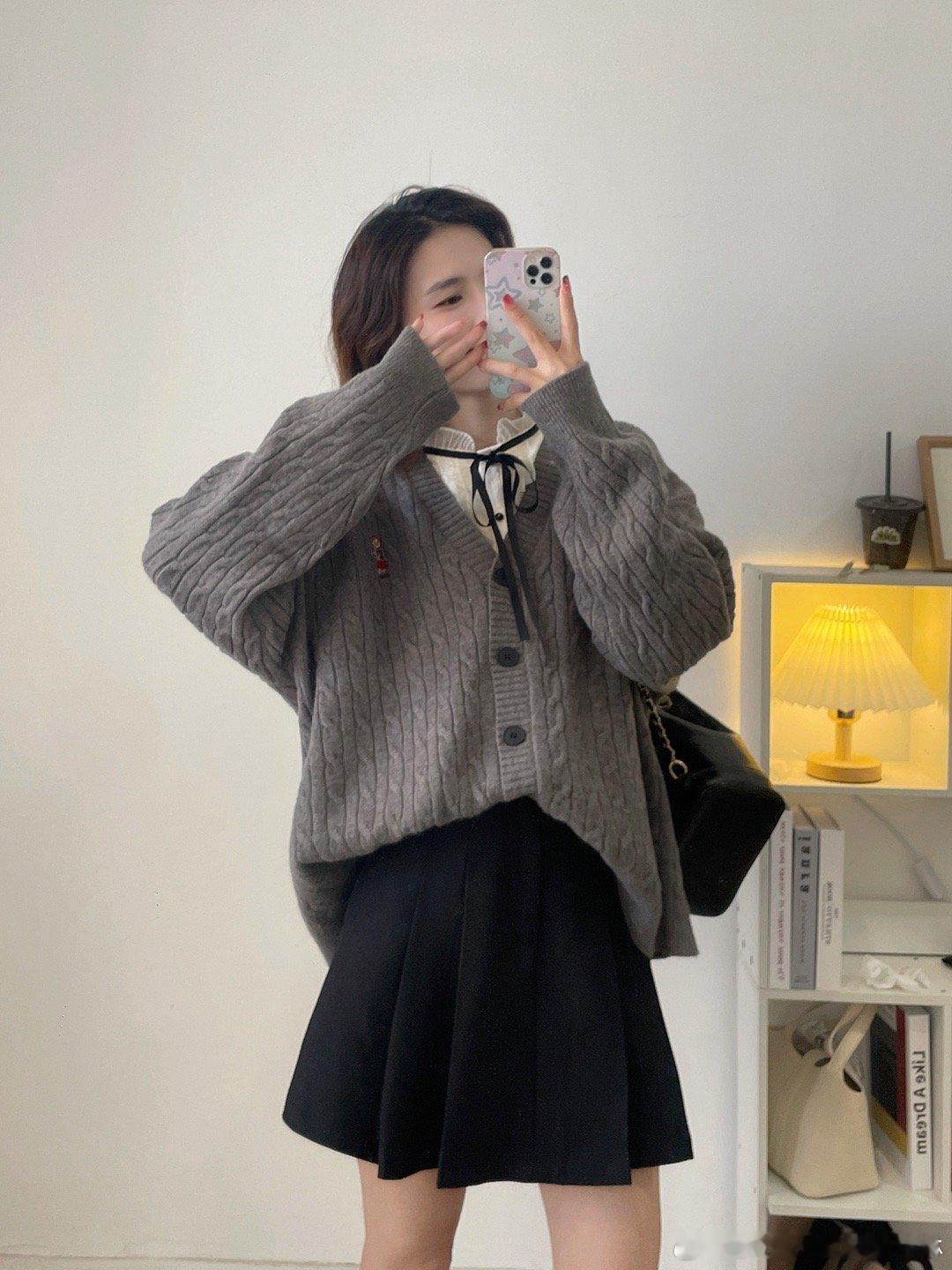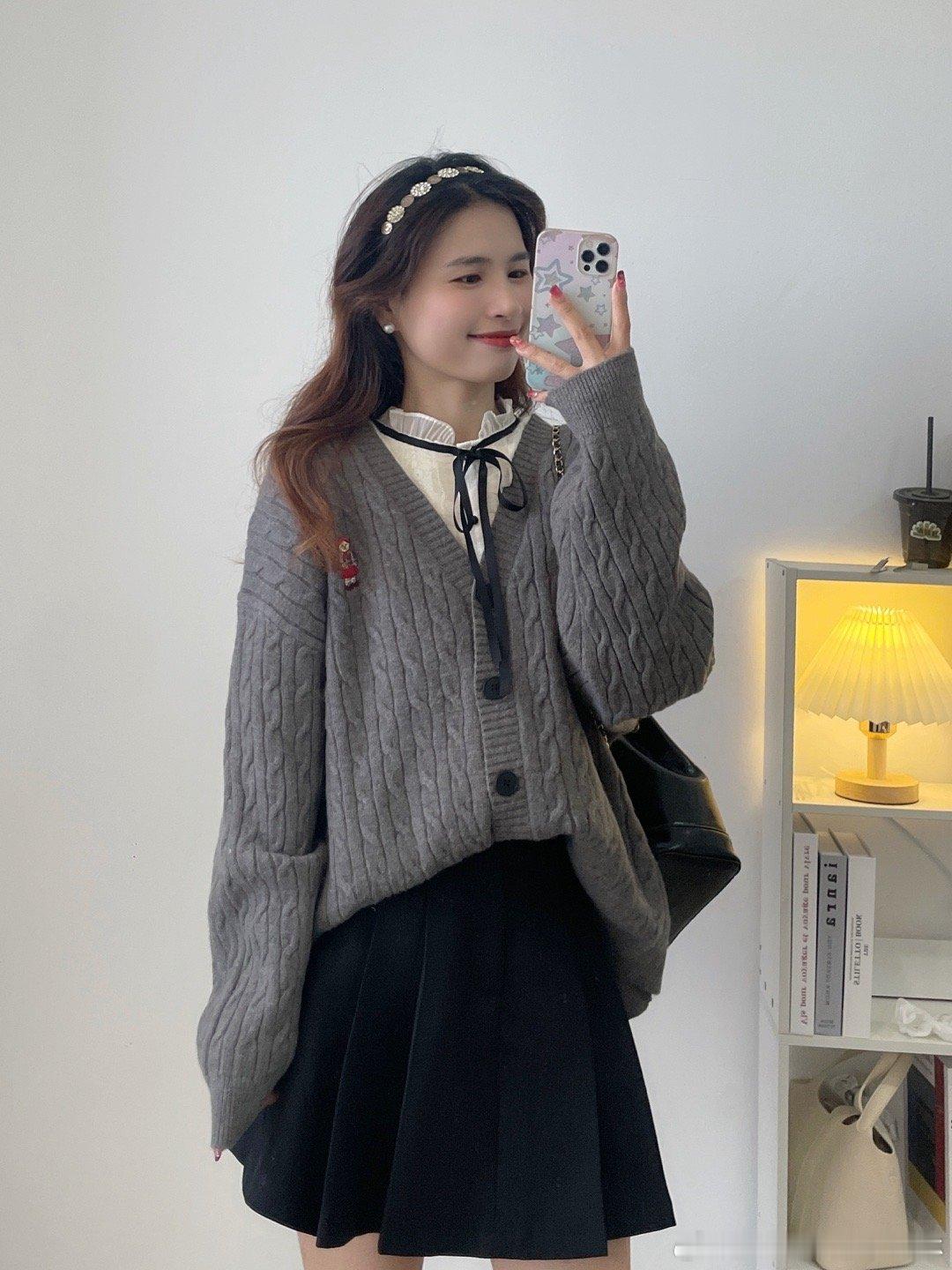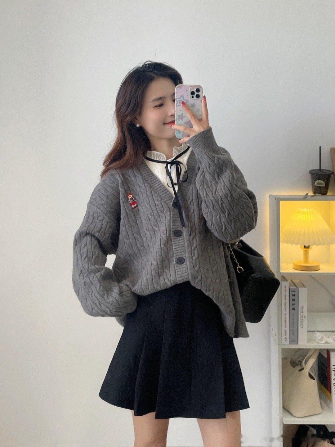 学院风满满的一款oversize针织毛衣开衫,面料是很厚实的一款哦!搭配店铺里面的百褶半身裙,在背个双肩包,学生的感觉瞬间来了。我个人好喜欢这种宽松版型