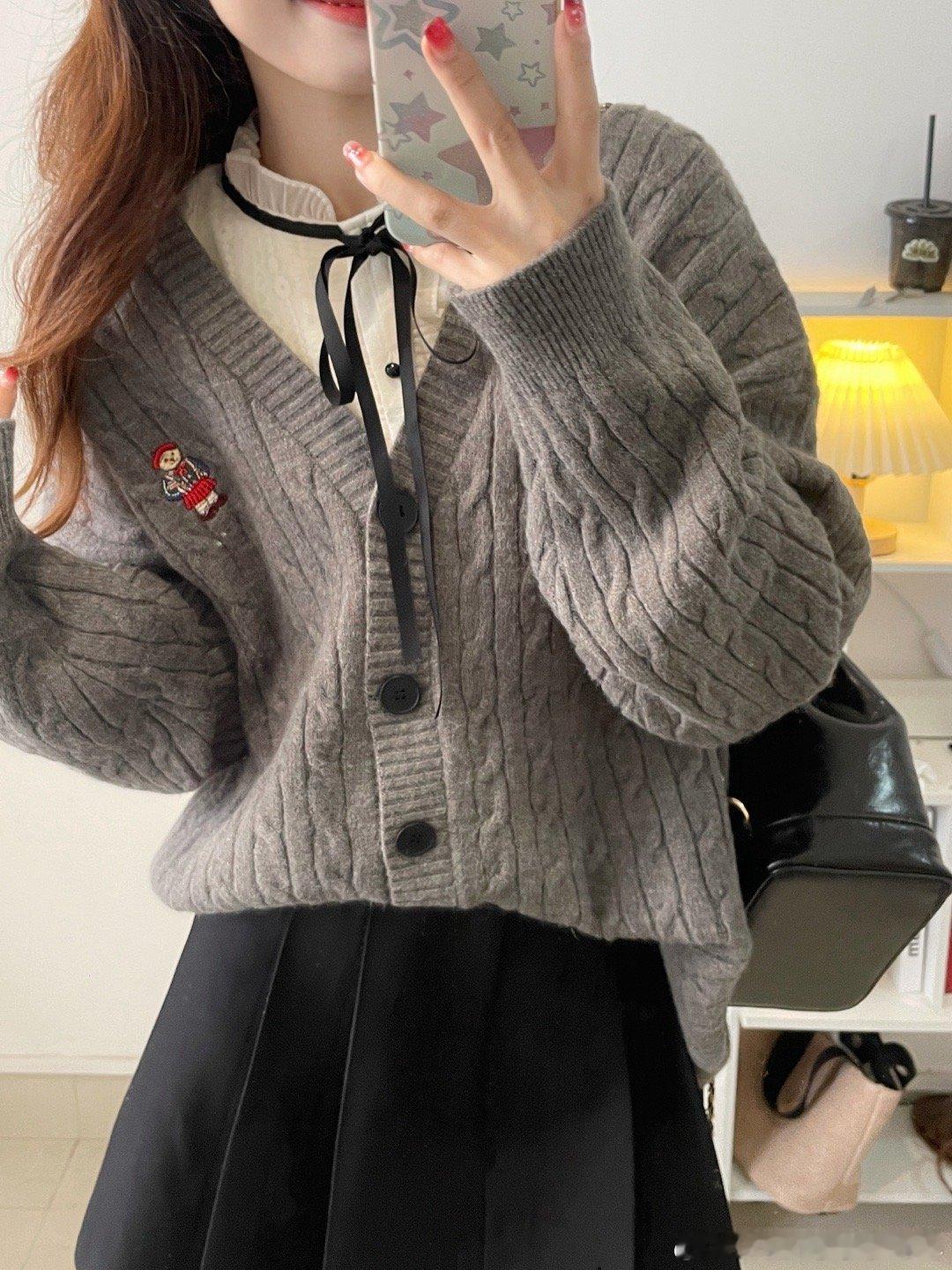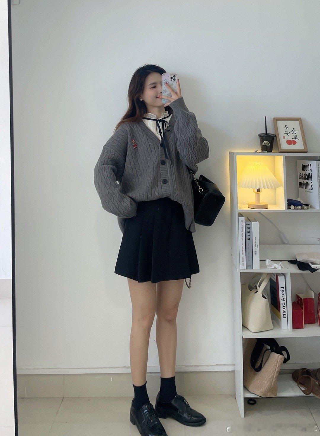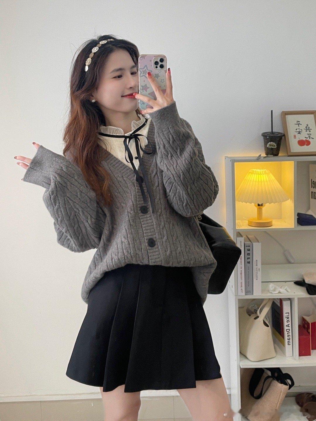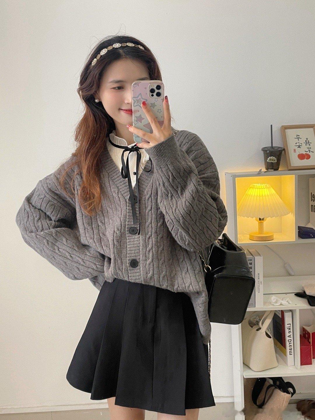 学院风满满的一款oversize针织毛衣开衫,面料是很厚实的一款哦!搭配店铺里面的百褶半身裙,在背个双肩包,学生的感觉瞬间来了。我个人好喜欢这种宽松版型