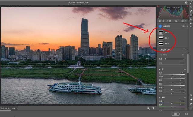 图二为原图,通过ACR打开后可以看到上方直方图,大约欠曝两档左右,并且阴影部分几乎不可见,夕阳和地景有一定光比。