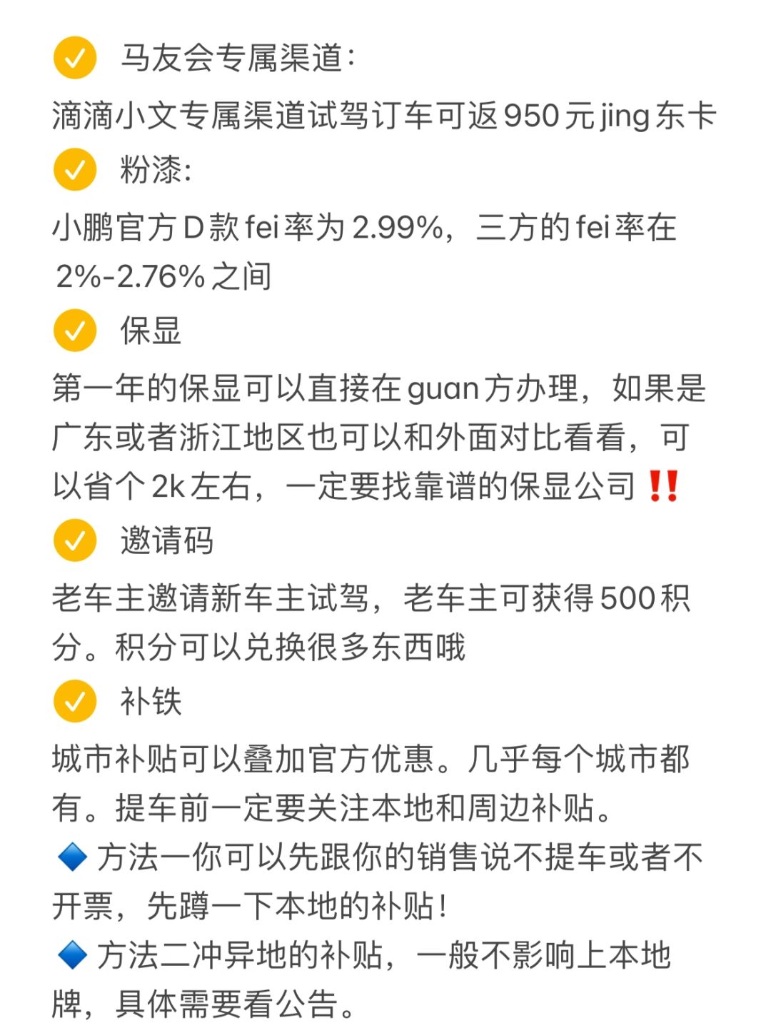 ✅马友会专属渠道: 滴滴小文专属渠道试驾订车可返950元jing东卡 ✅粉漆: 小鹏官方D款fei率为2.99%,三方的fei率在2%-2.76%之间 ✅保显 第一年的保显可以直接在guan方办理,如果是广东或者浙江地区也可以和外面对比看看,可以省个2k左右,一定要找靠谱的保显公司‼️ ✅邀请码 老车主邀请新车主试驾,老车主可获得500积分。积分可以兑换很多东西 ✅补贴 ✅充电桩 ✅贴膜 ✅上牌 - 关🐷我,每天分享电车小知识 让你从小白变老司机。 -