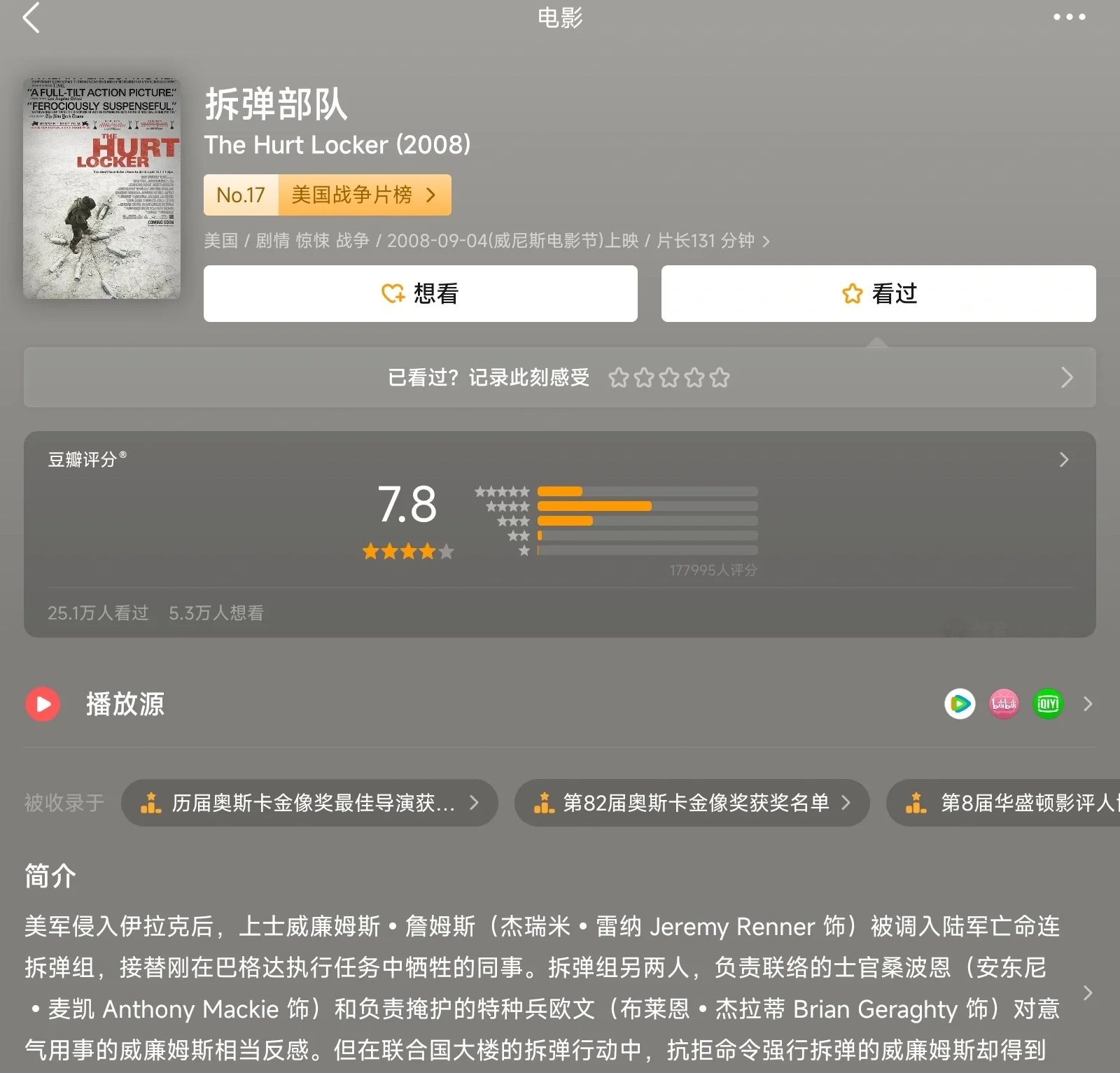 通过一个拆弹小组的视角,将美军在伊拉克战争中的真实状态展现出来。
