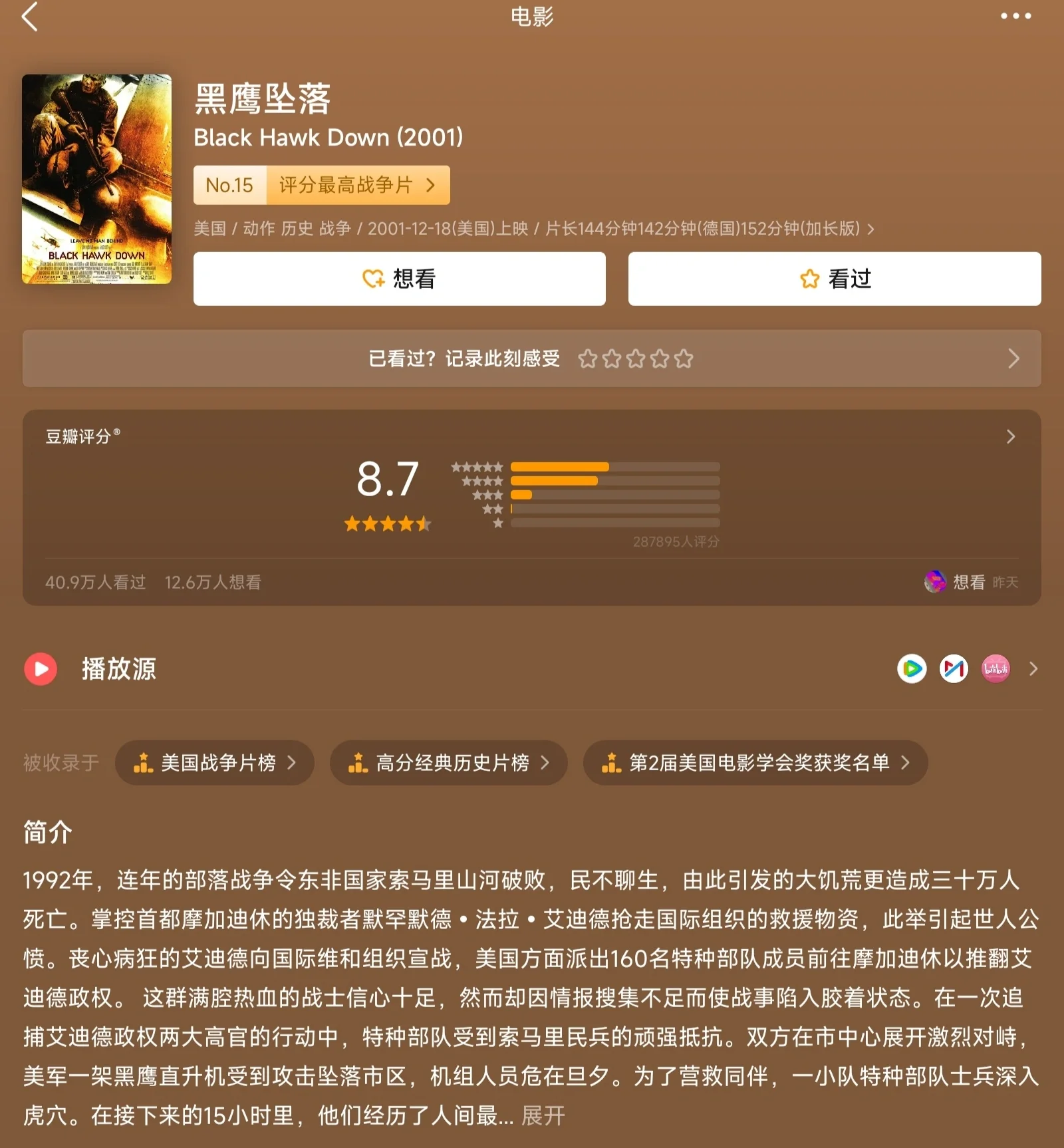1993年索马里战争,美国因情报错误而与索马里武装民兵进行持久巷战的过程影片着重于战争中的写实、残忍、暴烈,真实的反映了索马里内战对当地人带来的无尽痛苦。