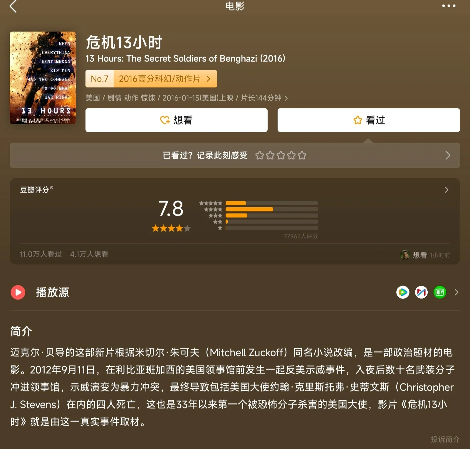 根据真实事件改编,主要讲述6名士兵组成的护卫队驻扎于利比亚班加西美国领事馆前,对抗数百名恐怖分子的故事。