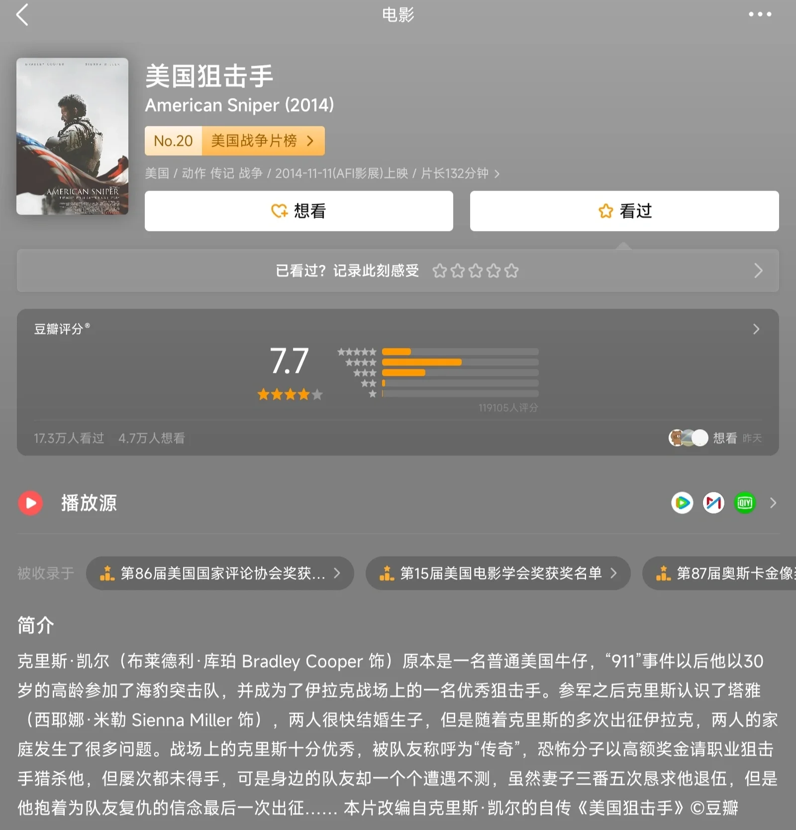 根据美国狙击手克里斯·凯尔的经历改编,他四次前往伊拉克参战并共射杀160名敌人,获得“最致命的神射手”称号。