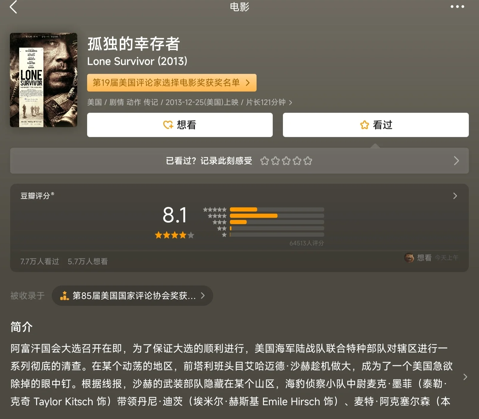 真实事件改编几个海豹突击队迅速果敢完成任务的诸多行动真人版的CS,很多镜头用第一人称,很有游戏代入感。