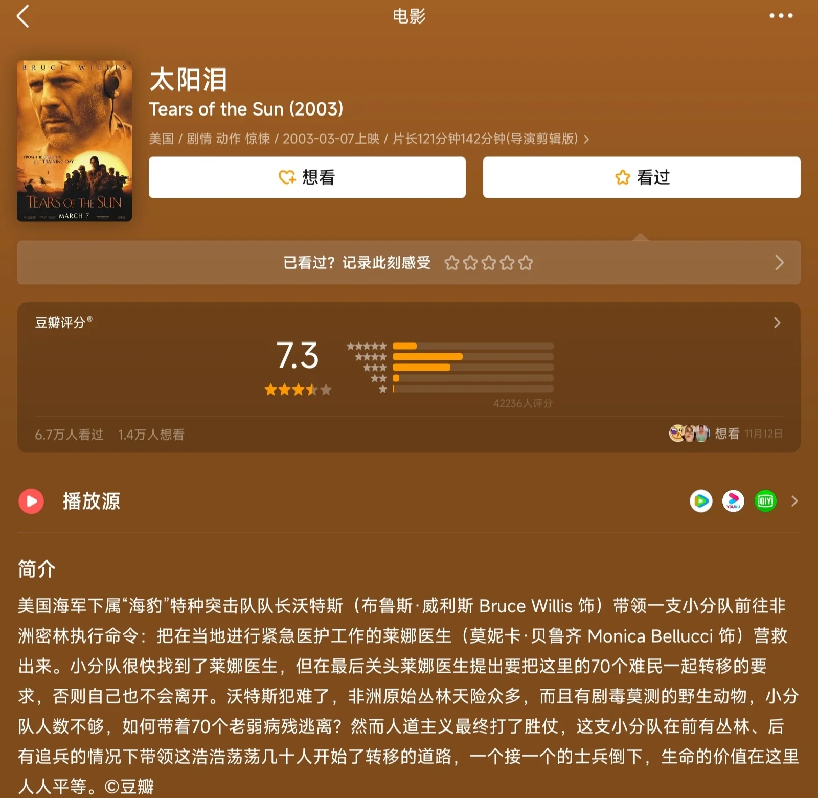 一支精干的“海豹”小队前往尼日利亚丛林,营救一位美国医生期间发生的故事。美式电影,救了难民牺牲了很多队友,后半段部分十分精彩。