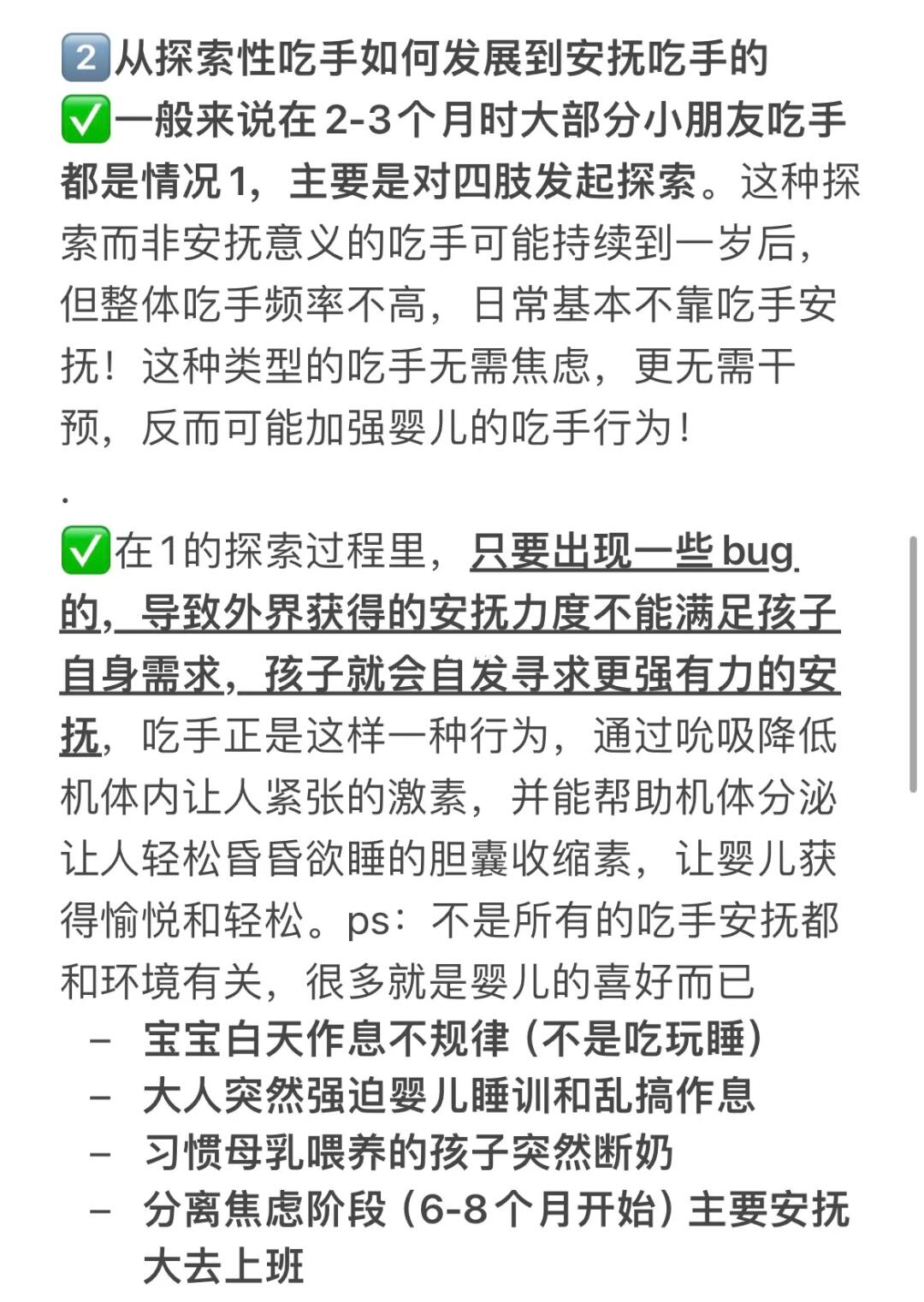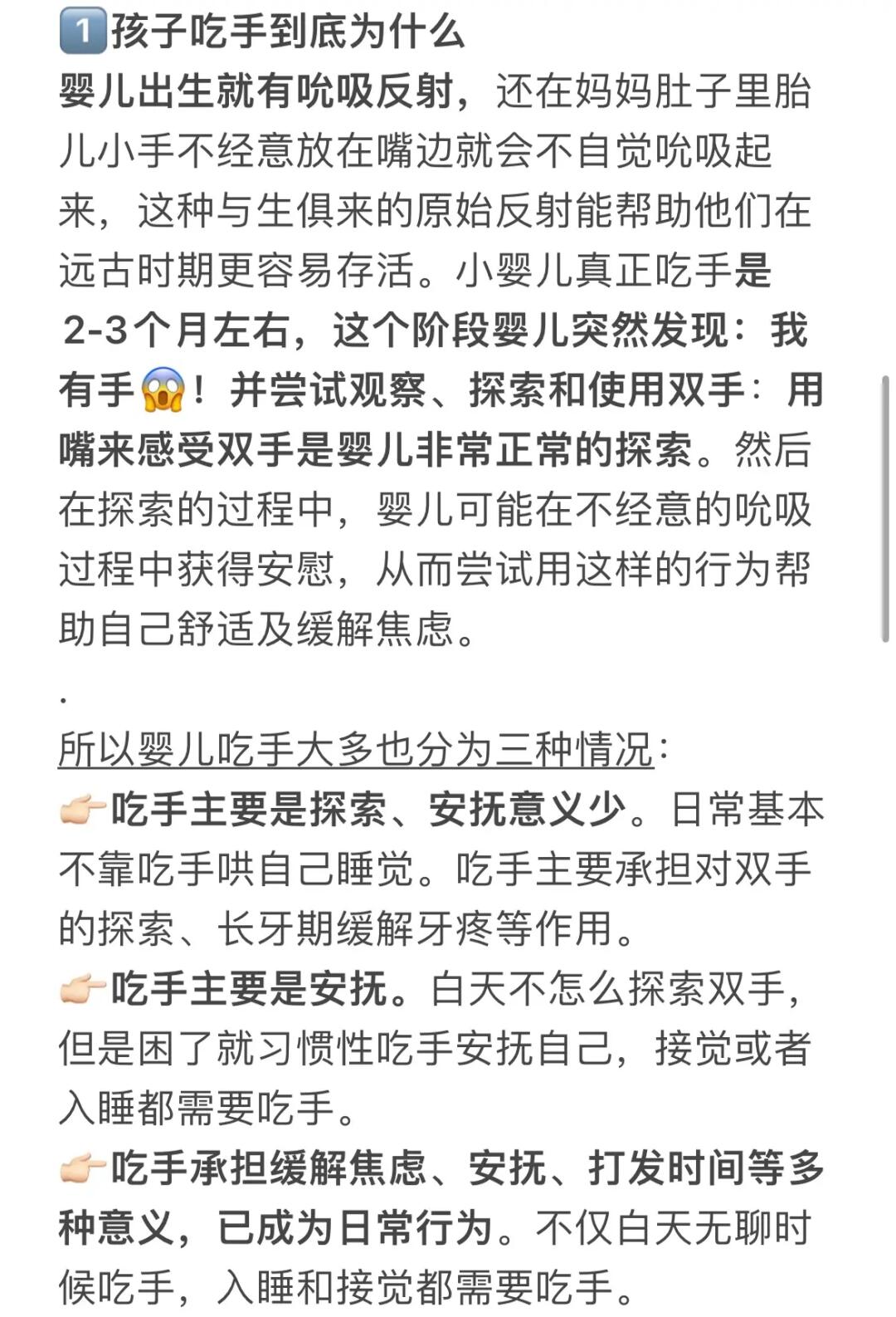 宝宝为什么频繁吃手:婴儿期是探索是好玩,幼儿期是安抚是帮助身体舒服,而儿童期大多就是缓解焦虑啊。如果你总是执着解决表面问题,而不去探索背后的成因,总想三天改善这个问题,而不是想着慢慢的帮助孩子从心理上解决这个问题,就算强硬戒断,也迟早会在其他方面迎来反扑。