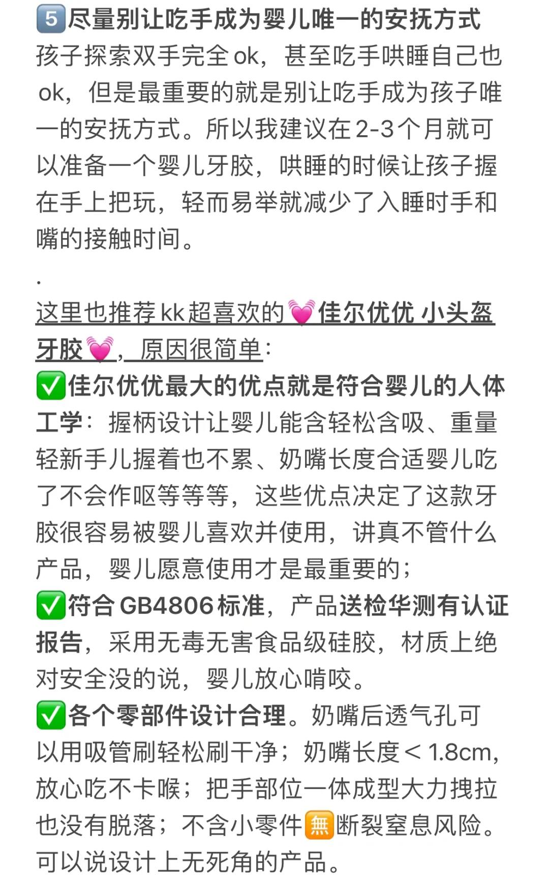 对于婴儿期刚开始学会吃手安抚时,kk就建议给孩子准备💓佳尔优优 小头盔牙胶💓,重量轻、奶嘴长度合适、符合婴儿使用方式,哄睡孩子时给孩子拿在手上把玩,轻而易举的就减少了不自觉吃手安抚这种行为,要知道预防可比养成安抚习惯后戒断容易太多。不干预孩子吃手探索,但是也尽量别让吃手成为婴儿唯一的安抚方式😭😭