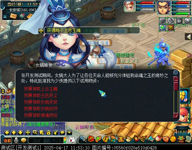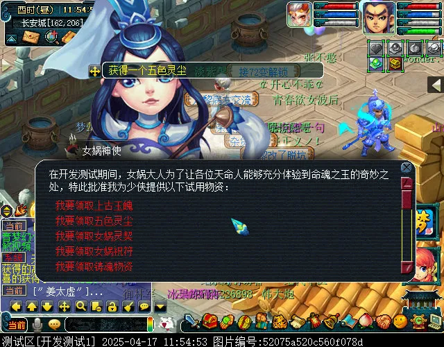 开发服的玩家还可以在女娲神使处领取五色灵尘,每位玩家最多领取六个。