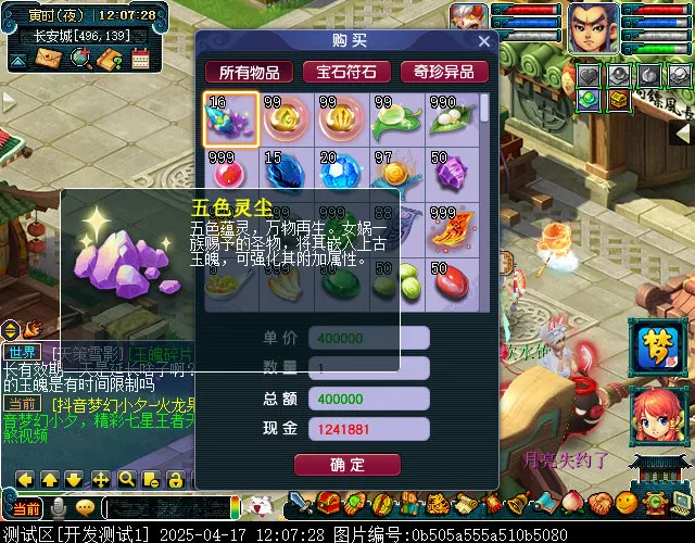 之后,笔者还探索到,这个灵尘可以在宝石商人处购买,初始价格未知,会随市场价格波动,40W可能是上限。从这里我们可以得知,其价值略高于星辉石,那附加的增益肯定也会比星辉石高点的。该道具可以给与他人,也可以摆摊出售,并且每次刷出的数量有限,这是否意味着有商机?