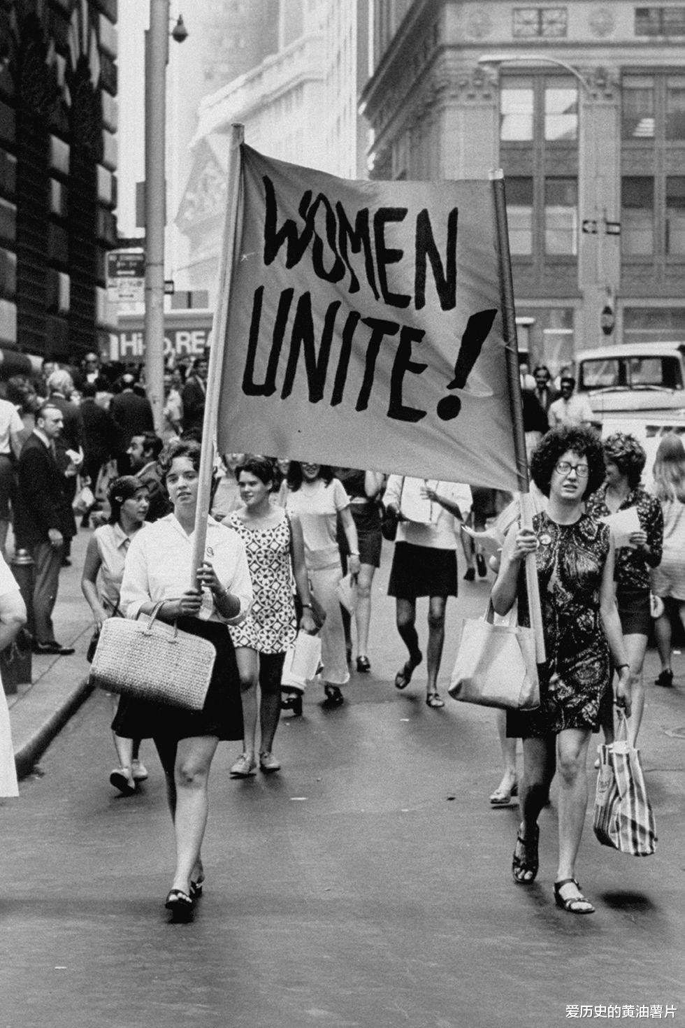 1970,在第五大道和华尔街游行的妇女们,她们拉着的横幅上写着“妇女们联合起来!”。