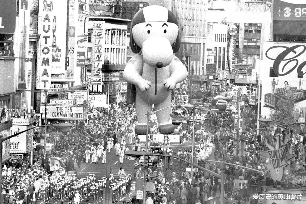 1969年,时代广场,第43届梅西百货感恩节大游行的史努比气球。该游行是梅西百货公司主办的一年一度的感恩节大游行,始于1927年。员工们在那时会装扮成小丑、牛仔等,从曼哈顿145街一直游行到梅西百货总部。游行用大气球来取代动物,所以大气球是该游行的重头戏之一。