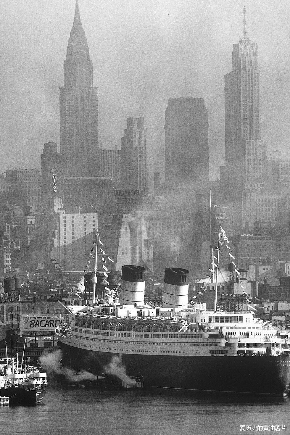 1958年,驶入纽约港口的客轮伊丽莎白女王号。背景是克莱斯勒大厦、查宁大厦和第五大道500号大楼。