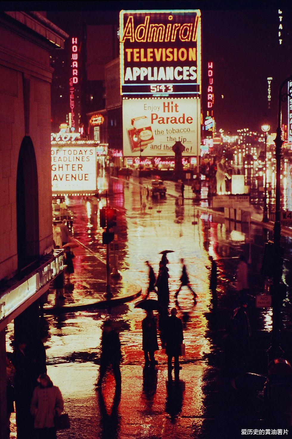 1957年,一张非常有氛围感的雨夜照片,背景为时代广场。