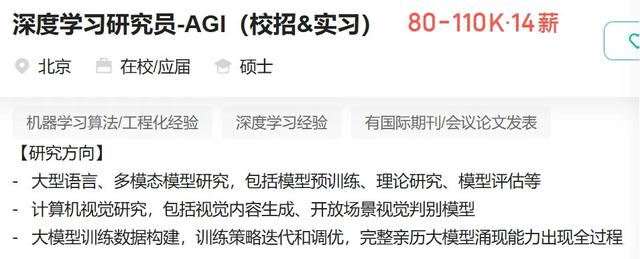 其中,“深度学习研究员-AGI”系年薪最高职位,月薪范围为8-11万元,最高年薪可达154万元。